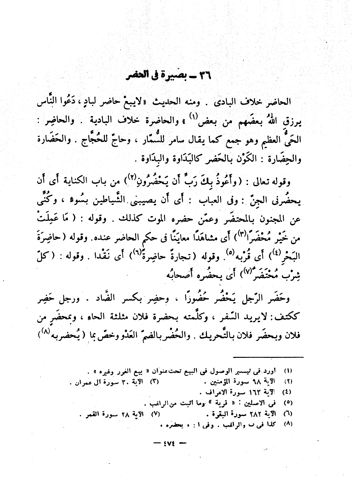 وقوله تعالى: {وَأَعُوذُ بِكَ رَبِّ أَن يَحْضُرُونِ} من باب الكناية أَى أَن يحضُرنى الجِنّ: وفى العباب: أَى أَن يصيبنى الشَّياطين بسُوءٍ، وكُنِّى عن المجنون بالمحتضَر وعمّن حضره الموت كذلك. وقوله: {مَّا عَمِلَتْ مِنْ خَيْرٍ مُّحْضَراً} أَى مشاهَداً معايَناً فى حكم الحاضر عنده. وقوله {حَاضِرَةَ البحر} أَى قُرْبه. وقوله {تِجَارَةً حَاضِرَةً} أَى نَقْدا. وقوله: {كُلُّ شِرْبٍ مُّحْتَضَرٌ} أَى يحضُره أَصحابُه.