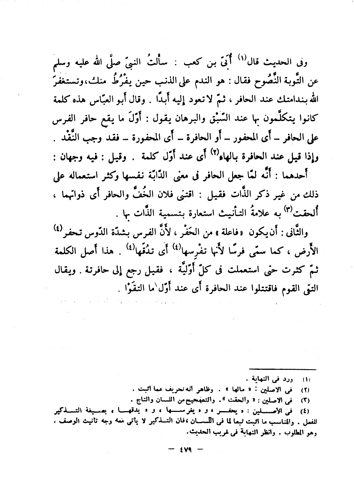 وفى الحديث قال أُبَىّ بن كعب: سأَلتُ النبىّ صلَّى الله عليه وسلم عن التَّوبة النَّصُوح فقال: هو الندم على الذنب حين يفْرُطُ منذ، وتستغفرَ الله بندامتك عند الحافر، ثمّ لا تعود إِليه أَبداً. وقال أَبو العبّاس هذه كلمة كانوا يتكلَّمون بها عند السّبْق والبرهان يقول: أَوّلَ ما يقع حافر الفرس على الحافر - أَى المحفور - أَو الحافرة - أَى المحفورة - فقد وجب النَّقد. وإِذا قيل عند الحافرة بالهاءِ أَى عند أَوّل كلمة. وقيل: فيه وجهان:
