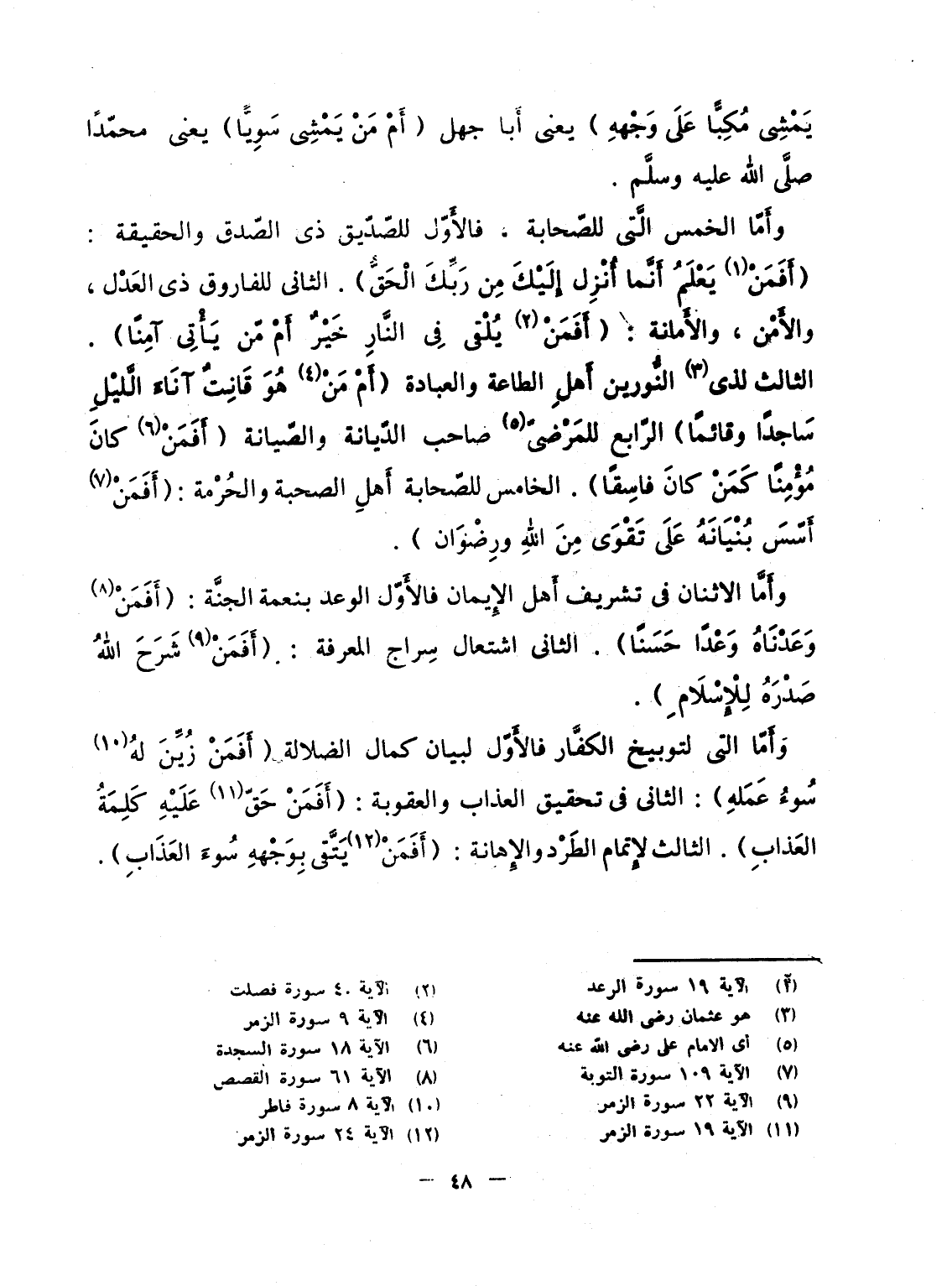 وأَمّا الخمس الَّتى للصّحابة، فالأَوّل للصّدّيق ذى الصّدق والحقيقة: {أَفَمَن يَعْلَمُ أَنَّمَآ أُنزِلَ إِلَيْكَ مِن رَبِّكَ الحق} . الثانى للفاروق ذى العَدْل، والأَمْن، والأَمانة: {أَفَمَن يلقى فِي النار خَيْرٌ أَم مَّن يأتي آمِناً} . الثالث لذى النُّورين أَهلِ الطاعة والعبادة {أَمَّنْ هُوَ قَانِتٌ آنَآءَ الليل سَاجِداً وَقَآئِماً} الرّابع للمَرْضىّ صاحب الدّيانة والصّيانة {أَفَمَن كَانَ مُؤْمِناً كَمَن كَانَ فَاسِقاً} . الخامس للصّحابة أَهلِ الصحبة والحُرْمة: {أَفَمَنْ أَسَّسَ بُنْيَانَهُ على تقوى مِنَ اللَّهِ وَرِضْوَانٍ} .
