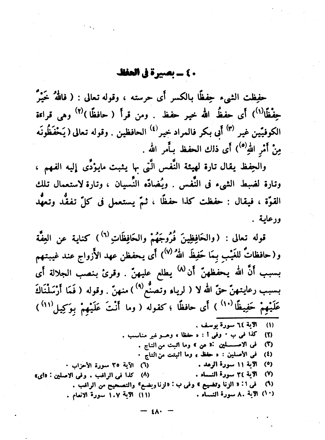 قوله تعالى: {والحافظين فُرُوجَهُمْ والحافظات} كناية عن العِفَّة و {حَافِظَاتٌ لِّلْغَيْبِ بِمَا حَفِظَ الله} أَى يحفظن عهد الأَزواج عند غيبتهم بسبب أَنَّ الله يحفظهنّ أَن يطلع عليهنّ. وقرئ بنصب الجلالة أَى بسبب رعايتهنّ حقّ الله لا (لرياءِ وتصنُّع) منهنّ. وقوله {فَمَآ أَرْسَلْنَاكَ عَلَيْهِمْ حَفِيظاً} أَى حافظاً؛ كقوله {وَمَآ أَنتَ عَلَيْهِم بِوَكِيلٍ}