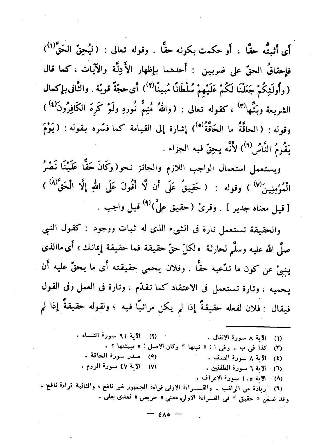 أَى أَثبتُّه حقَّا، أَو حكمت بكونه حقّاً. وقوله تعالى: {لِيُحِقَّ الحق} فإِحقاقُ الحقّ على ضربين: أَحدهما بإِظهار الأَدِلَّة والآيات، كما قال {وأولائكم جَعَلْنَا لَكُمْ عَلَيْهِمْ سُلْطَاناً مُّبِيناً} أَى حجّةً قويّة. والثَّانى بإِكمال الشريعة وبَثِّها، كقوله تعالى: {والله مُتِمُّ نُورِهِ وَلَوْ كَرِهَ الكافرون} وقوله: {الحاقة مَا الحاقة} إِشارة إِلى القيامة كما فسّره بقوله: {يَوْمَ يَقُومُ الناس} لأَنَّه يحِقّ فيه الجزاء.