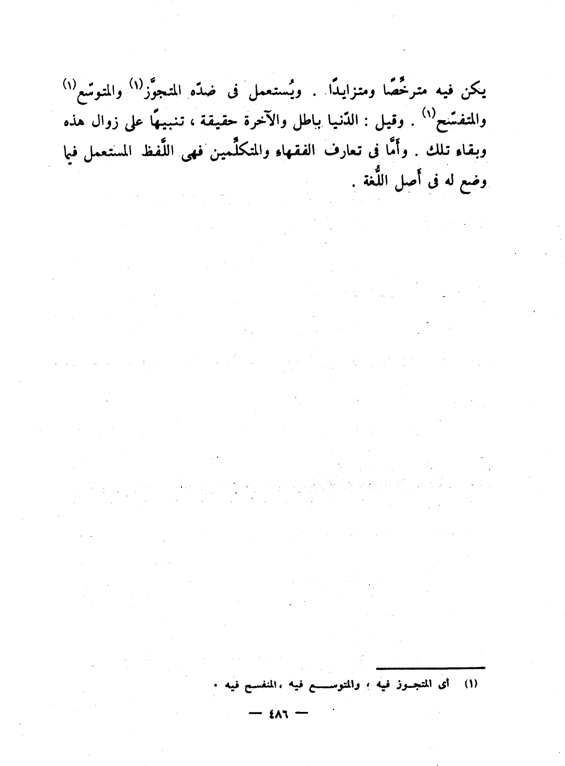 يكن فيه مترخِّصاً ومتزايداً. ويُستعمل فى ضدّه المتجوَّز والمتوسّع والمتفسّح. وقيل: الدّنيا باطل والآخرة حقيقة، تنبيهاً على زوال هذه وبقاءِ تلك. وأَمَّا فى تعارف الفقهاءِ والمتكلِّمين فهى اللَّفظ المستعمل فيما وضع له فى أَصل اللُّغة.