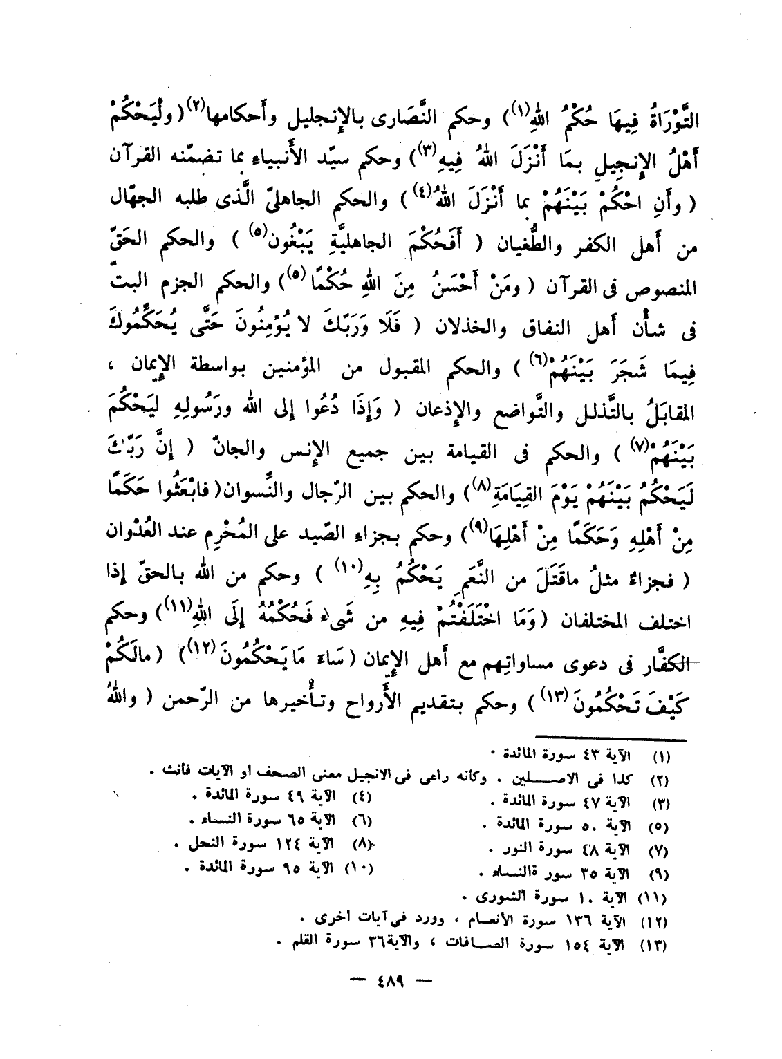 التوراة فِيهَا حُكْمُ الله} وحكم النَّصَارى بالإِنجيل وأَحكامها {وَلْيَحْكُمْ أَهْلُ الإنجيل بِمَآ أَنزَلَ الله فِيهِ} وحكم سيّد الأَنبياءِ بما تضمّنه القرآن {وَأَنِ احكم بَيْنَهُمْ بِمَآ أَنزَلَ الله} والحكم الجاهلىّ الَّذى طلبه الجهّال من أَهل الكفر والطُّغيان {أَفَحُكْمَ الجاهلية يَبْغُونَ} والحكم الحَقّ المنصوص فى القرآن {وَمَنْ أَحْسَنُ مِنَ الله حُكْماً} والحكم الجزم البتّ فى شأْن أَهل النفاق والخذلان {فَلاَ وَرَبِّكَ لاَ يُؤْمِنُونَ حتى يُحَكِّمُوكَ فِيمَا شَجَرَ بَيْنَهُمْ} والحكم المقبول من المؤمنين بواسطة الإِيمان، المقابَلُ بالتَّذلل والتَّواضع والإِذعان {وَإِذَا دعوا إِلَى الله وَرَسُولِهِ لِيَحْكُمَ بَيْنَهُمْ} والحكم فى القيامة بين جميع الإِنس والجانّ {وَإِنَّ رَبَّكَ لَيَحْكُمُ بَيْنَهُمْ يَوْمَ القيامة} والحكم بين الرّجال والنِّسوان {فابعثوا حَكَماً مِّنْ أَهْلِهِ وَحَكَماً مِّنْ أَهْلِهَآ} وحكم بجزاءِ الصّيد على المُحْرِم عند العُدْوان {فَجَزَآءٌ مِّثْلُ مَا قَتَلَ مِنَ النعم يَحْكُمُ بِهِ} وحكم من الله بالحقّ إِذا اختلف المختلفان {وَمَا اختلفتم فِيهِ مِن شَيْءٍ فَحُكْمُهُ إِلَى الله} وحكم الكفَّار فى دعوى مساواتِهم مع أَهل الإِيمان {سَآءَ مَا يَحْكُمُونَ} {مَا لَكُمْ كَيْفَ تَحْكُمُونَ} وحكم بتقديم الأَرواح وتأْخيرها من الرّحمن {والله