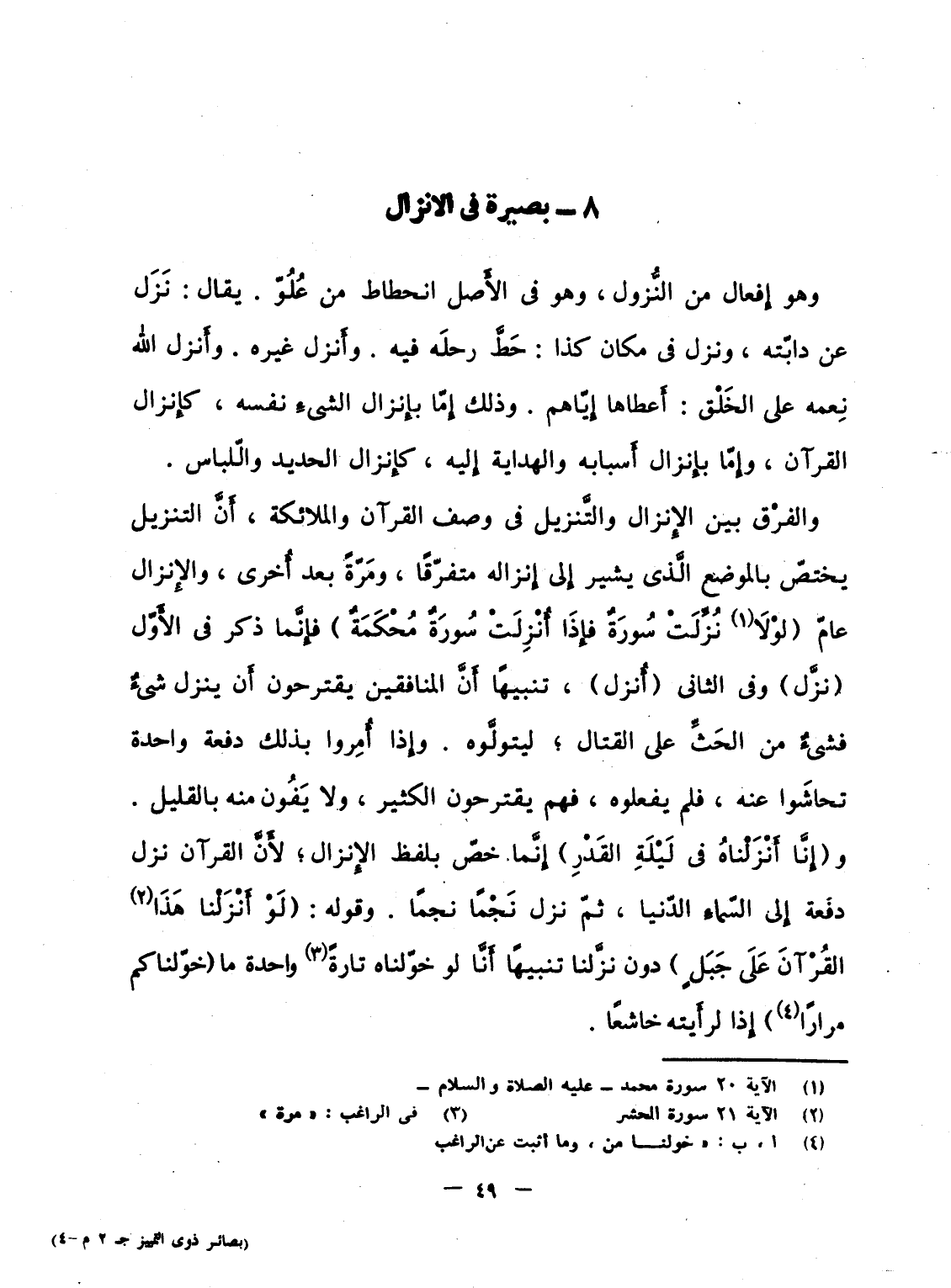 والفرْق بين الإِنزال والتَّنزيل فى وصف القرآن والملائكة، أَنَّ التنزيل يختصّ بالموضع الَّذى يشير إِلى إِنزاله متفرّقاً، ومَرّةً بعد أُخرى، والإِنزال عامّ {لَوْلاَ نُزِّلَتْ سُورَةٌ فَإِذَآ أُنزِلَتْ سُورَةٌ مُّحْكَمَةٌ} فإِنَّما ذكر فى الأَوّل (نزَّل) وفى الثانى (أُنزل) ، تنبيهاً أَنَّ المنافقين يقترحون أَن ينزل شيءٌ فشئٌ من الحَثِّ على القتال؛ ليتولَّوه. وإِذا أُمِروا بذلك دفعة واحدة تحاشَوا عنه، فلم يفعلوه، فهم يقترحون الكثير، ولا يَفُون منه بالقليل. و {إِنَّا أَنْزَلْناهُ في لَيْلَةِ القَدْرِ} إِنَّما خصّ بلفظ الإِنزال، لأَنَّ القرآن نزل دفعة إِلى السّماءِ الدّنيا، ثمّ نزل نَجْماً نجماً. وقوله: {لَوْ أَنزَلْنَا هاذا القرآن على جَبَلٍ} دون نزَّلنا تنبيهاً أَنَّا لو خوّلناه تارةً واحدة ما (خوّلناكم مراراً) إِذا لرأَيته خاشعاً.