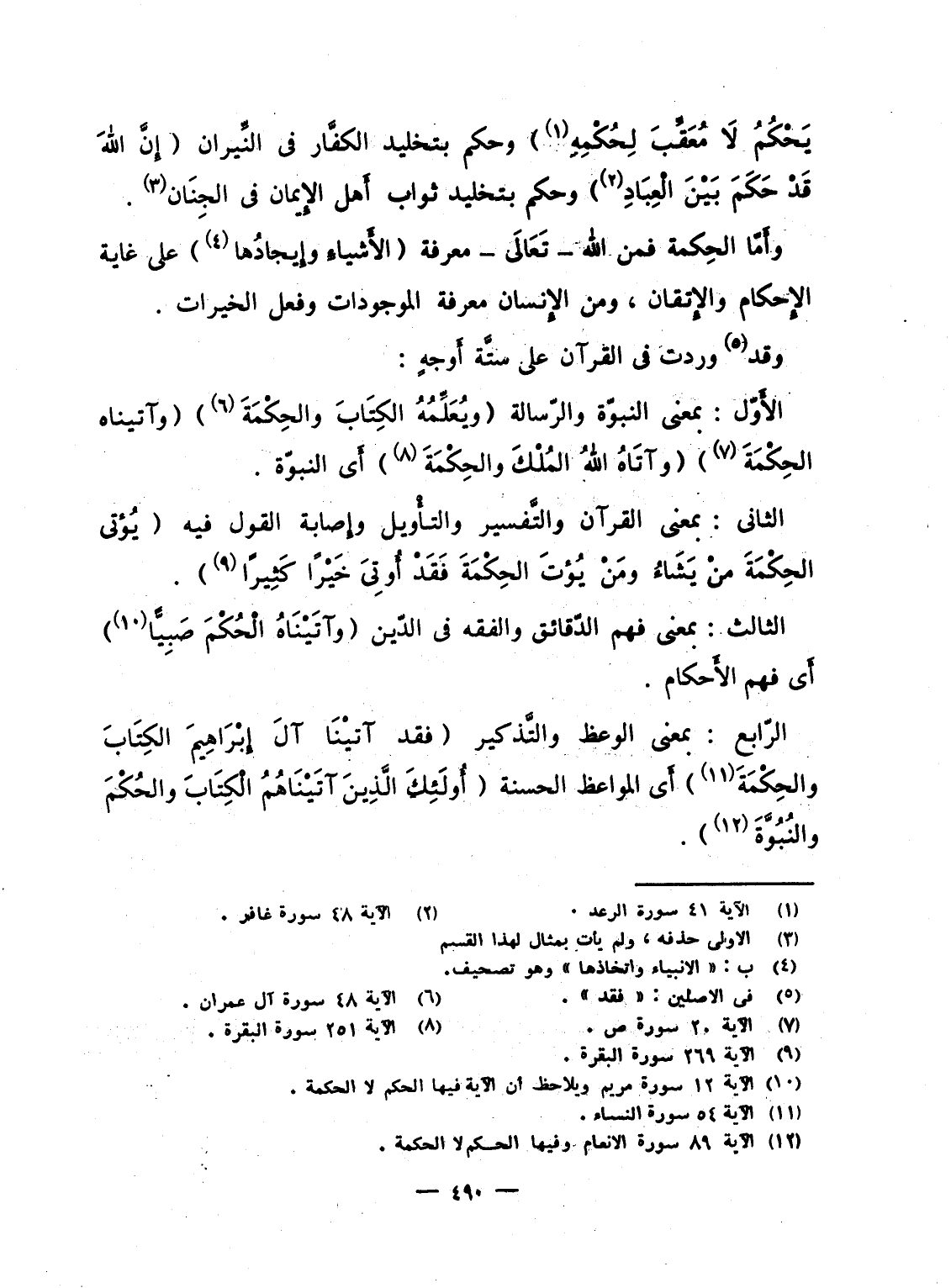 الثانى: بمعنى القرآن والتَّفسير والتأْويل وإِصابة القول فيه {يُؤْتِي الْحِكْمَةَ مَن يَشَآءُ وَمَن يُؤْتَ الْحِكْمَةَ فَقَدْ أُوتِيَ خَيْراً كَثِيراً} .