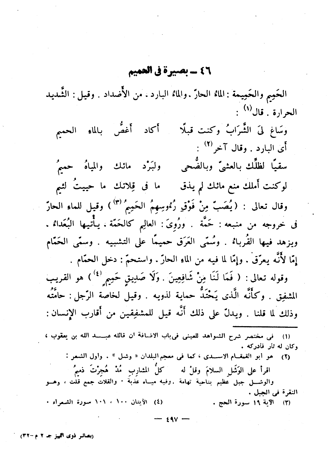 وقال تعالى: {يُصَبُّ مِن فَوْقِ رُءُوسِهِمُ الحميم} وقيل للماءِ الحارّ فى خروجه من منبعه: حَمَّة. ورُوِىَ: العالِم كالحَمّة، يأْتيها البُعَداءُ، ويزهد فيها القُرباءُ. وسُمّى العَرَق حميماً على التشبيه. وسمّى الحَمّام إِمّا لأَنَّه يعرّق، وإِمّا لما فيه من الماءِ الحارّ، واستحمّ: دخل الحمّام.