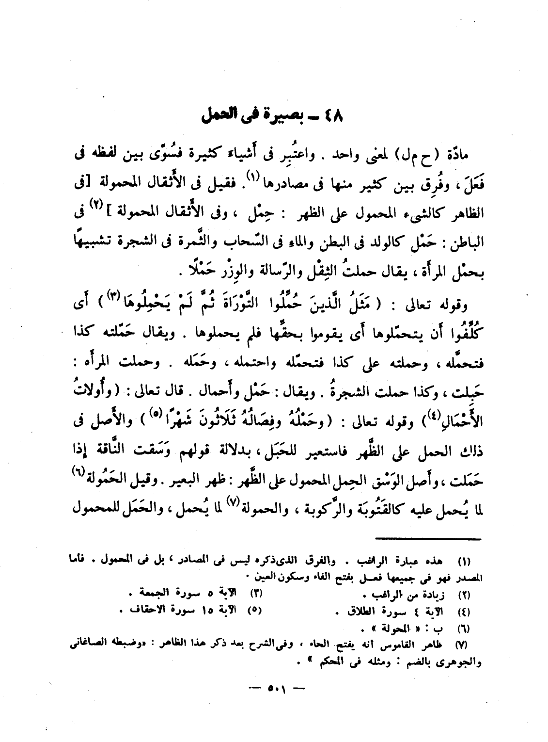 وقوله تعالى: {مَثَلُ الذين حُمِّلُواْ التوراة ثُمَّ لَمْ يَحْمِلُوهَا} أَى كُلِّفُوا أَن يتحمّلوها أَى يقوموا بحقِّها فلم يحملوها. ويقال حَمّلته كذا فتحمَّله، وحملته على كذا فتحمّله واحتمله، وحَمَله. وحملت المرأَه: حَبِلت، وكذا حملت الشجرةُ. ويقال: حَمْل وأَحمال. قال تعالى: {وَأُوْلاَتُ الأحمال} وقوله تعالى: {وَحَمْلُهُ وَفِصَالُهُ ثَلاَثُونَ شَهْراً} والأَصل فى ذلك الحمل على الظَّهر فاستعير للحَبَل، بدلالة قولهم وَسَقت النَّاقة إِذا حَمَلت، وأَصل الوَسْق الحِمل المحمول على الظَّهر: ظهر البعير. وقيل الحَمُولة لما يُحمل عليه كالقَتُوبَة والرَّكوبة، والحمولة لما يُحمل، والحَمَل للمحمول