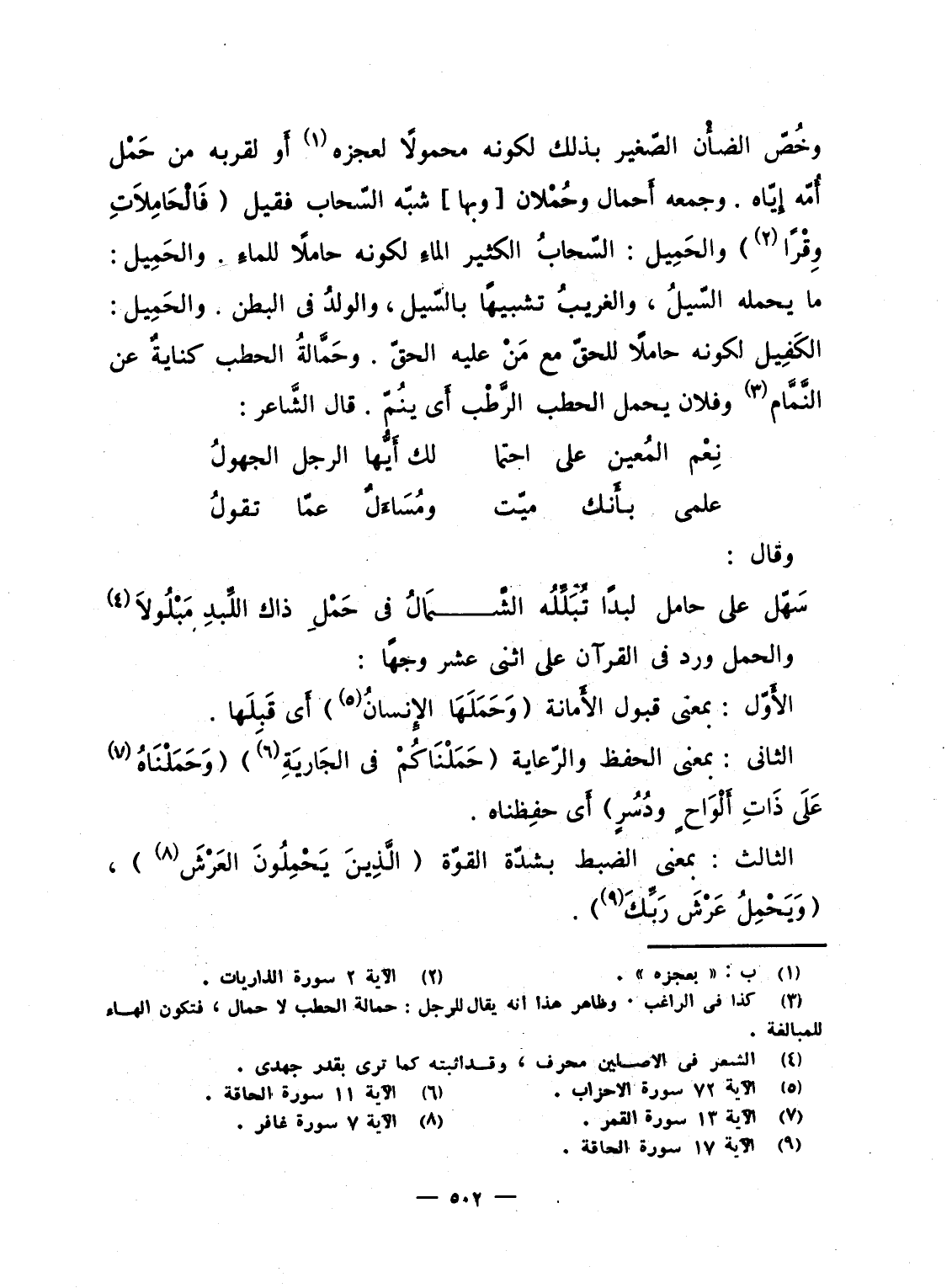 وخُصّ الضأْن الصّغير بذلك لكونه محمولاً لعجزه أَو لقربه من حَمْل أُمّه إِيّاه. وجمعه أَحمال وحُمْلان [وبها] شبّه السّحاب فقيل {فالحاملات وِقْراً} والحَمِيل: السّحابُ الكثير الماءِ لكونه حاملاً للماءِ. والحَمِيل: ما يحمله السّيلُ، والغريبُ تشبيهاً بالسّيل، والولدُ فى البطن. والحَمِيل: الكَفِيل لكونه حاملاً للحقّ مع مَنْ عليه الحقّ. وحَمَّالةُ الحطب كنايةٌ عن النَّمَّام وفلان يحمل الحطب الرَّطْب أَى ينُمّ. قال الشَّاعر: