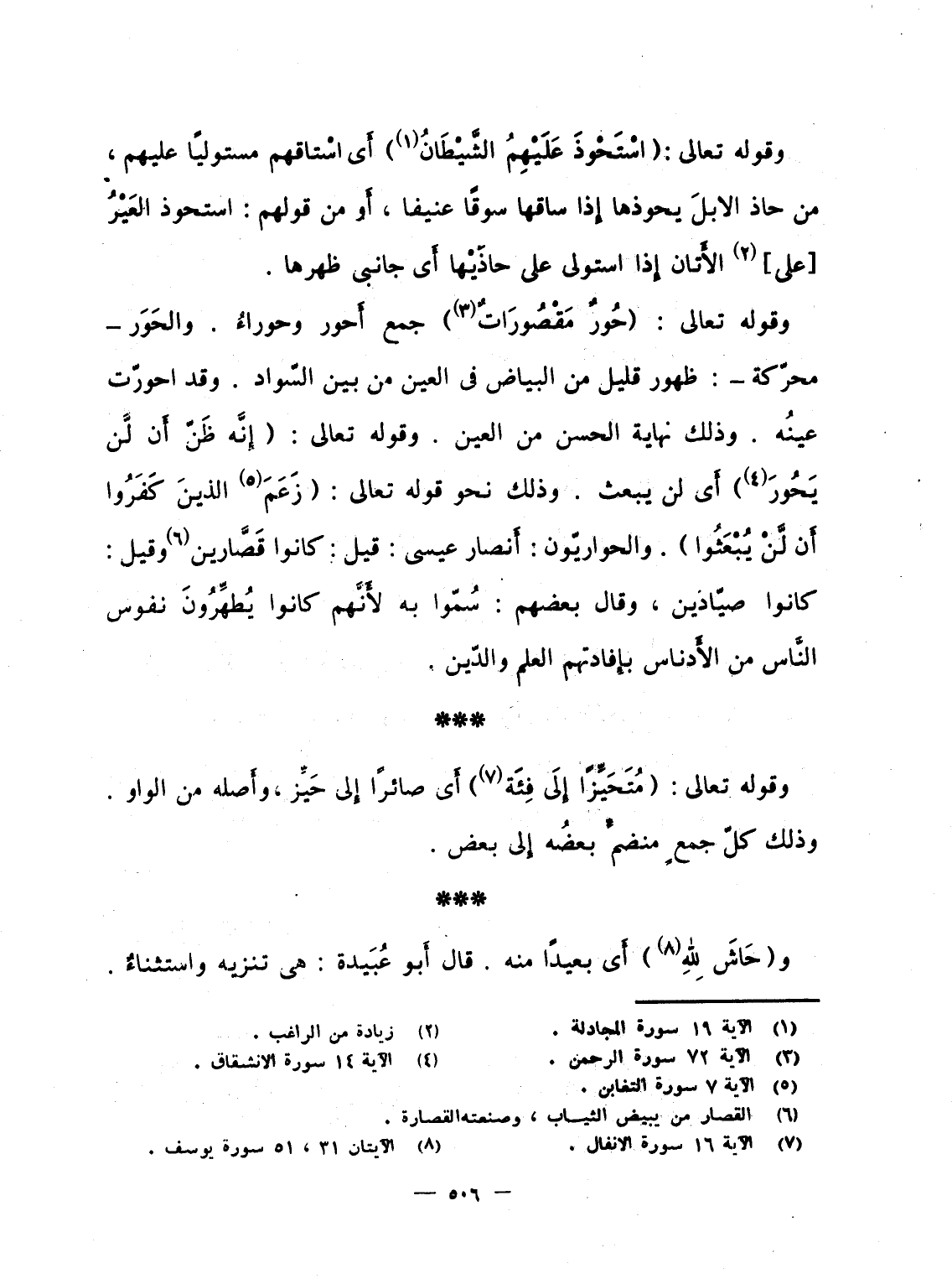وقوله تعالى: {حُورٌ مَّقْصُورَاتٌ} جمع أَحور وحوراءُ. والحَوَر - محرّكة -: ظهور قليل من البياض فى العين من بين السّواد. وقد احورّت عينُه. وذلك نهاية الحسن من العين. وقوله تعالى: {إِنَّهُ ظَنَّ أَن لَّن يَحُورَ} أَى لن يبعث. وذلك نحو قوله تعالى: {زَعَمَ الذين كفروا أَن لَّن يُبْعَثُواْ} والحواريّون: أَنصار عيسى: قيل: كانوا قَصَّارين وقيل: كانوا صيّادين، وقال بعضهم: سُمّوا به لأَنَّهم كانوا يُطهِّرُونَ نفوس النَّاس من الأَدناس بإِفادتهم العلم والدّين.