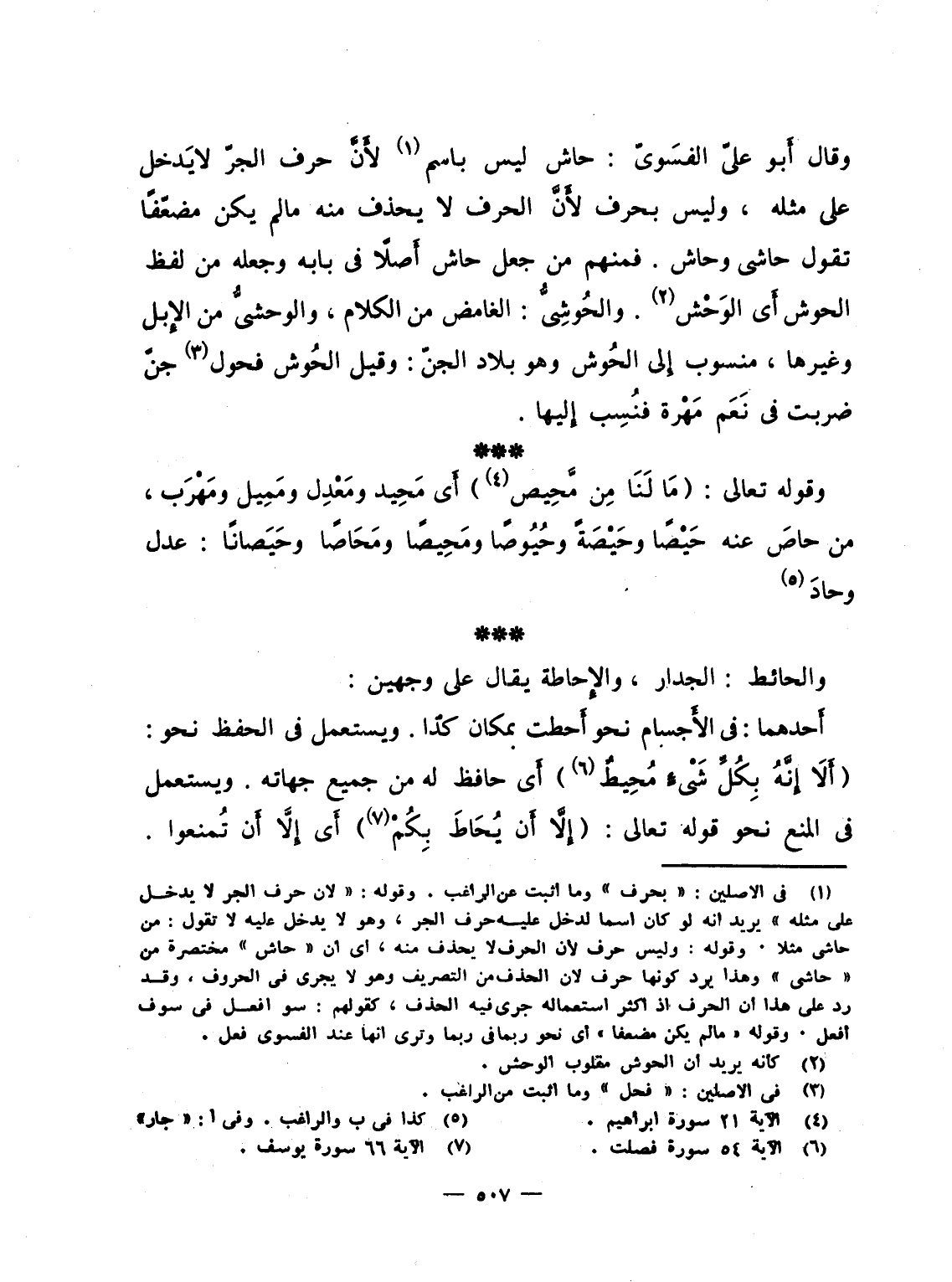 وقال أَبو علىّ الفسَوىّ: حاش ليس باسم لأَنَّ حرف الجرّ لا يَدخل على مثله، وليس بحرف لأَنَّ الحرف لا يحذف منه ما لم يكن مضعّفاً تقول حاشى وحاشَ. فمنهم من جعل حاش أَصلاً فى بابه وجعله من لفظ الحوش أَى الوَحْش. والحُوشِىُّ: الغامض من الكلام، والوحشىُّ من الإِبل وغيرها، منسوب إِلى الحُوش وهو بلاد الجنّ: وقيل الحُوش فحول جنّ ضربت فى نَعَم مَهْرة فنُسِب إِليها.