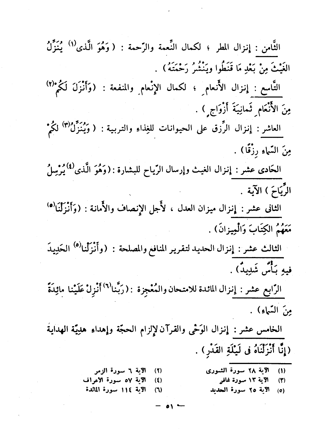 الخامس عشر: إِنزال الوَحْى والقرآن لإِلزام الحجّة وإِهداءِ هدِيّة الهداية {إِنَّا أَنْزَلْنَاهُ فى لَيْلَةِ القَدْرِ} .