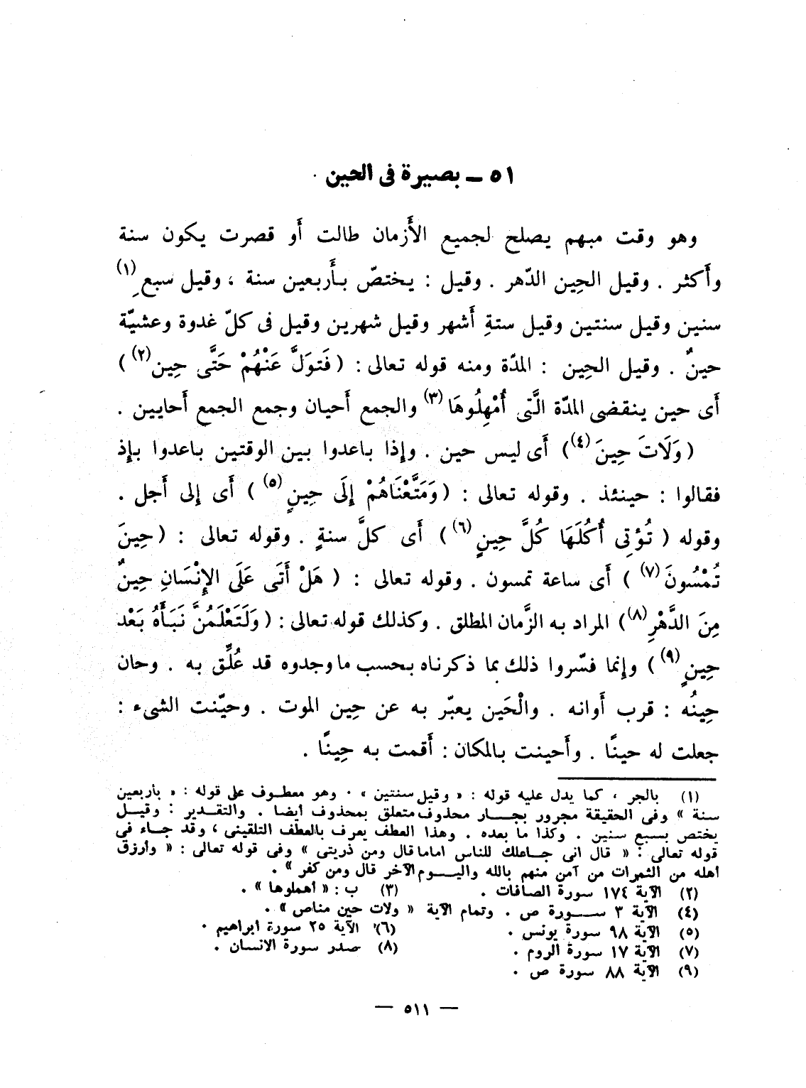 {وَّلاَتَ حِينَ} أَى ليس حين. وإِذا باعدوا بين الوقتين باعدوا بإِذ فقالوا: حينئذ. وقوله تعالى: {وَمَتَّعْنَاهُمْ إلى حِينٍ} أَى إِلى أَجل. وقوله {تؤتي أُكُلَهَا كُلَّ حِينٍ} أَى كلَّ سنةٍ. وقوله تعالى: {حِينَ تُمْسُونَ} أَى ساعة تمسون. وقوله تعالى: {هَلْ أتى عَلَى الإنسان حِينٌ مِّنَ الدهر} المراد به الزَّمان المطلق. وكذلك قوله تعالى: {وَلَتَعْلَمُنَّ نَبَأَهُ بَعْدَ حِينِ} وإِنما فسّروا ذلك مما ذكرناه بحسب ما وجدوه قد عُلِّق به. وحان حِينُه: قرب أَوانه. والْحين يعبّر به عن حِين الموت. وحيّنت الشئ: جعلت له حيناً. وأَحينت بالمكان: أَقمت به حِيناً.