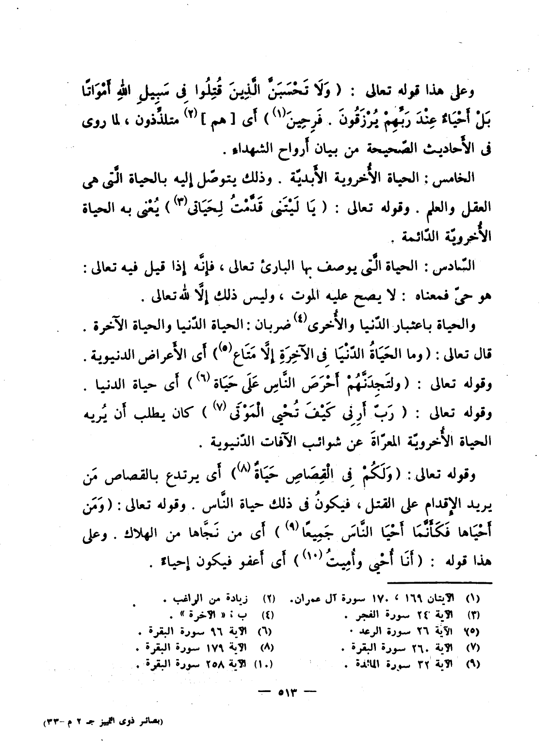 الخامس: الحياة الأُخروية الأَبديّة. وذلك يتوصّل إِليه بالحياة الَّتى هى العقل والعلم. وقوله تعالى: {ياليتني قَدَّمْتُ لِحَيَاتِي} يُعْنى به الحياة الأُخرويّة الدّائمة.