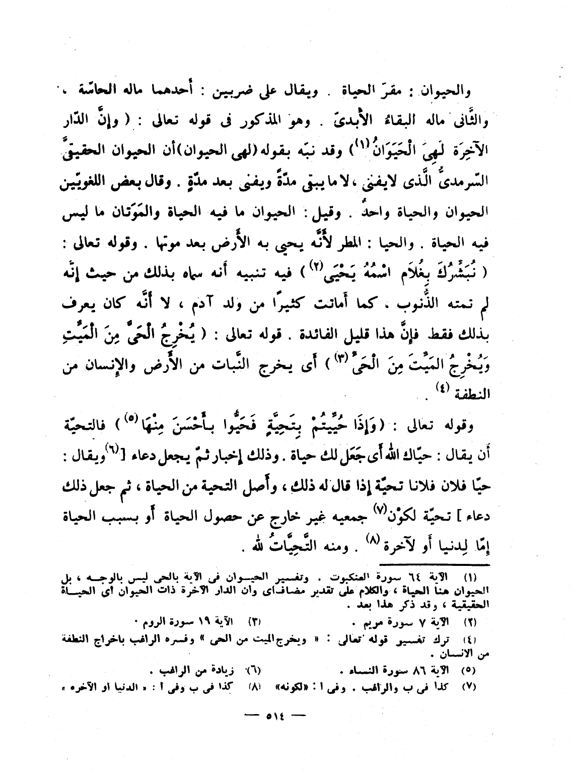 والحيوان: مقرّ الحياة. ويقال على ضربين: أَحدهما ماله الحاسّة، والثَّانى ماله البقاءُ الأَبدىّ. وهو المذكور فى قوله تعالى: {وَإِنَّ الدار الآخرة لَهِيَ الحيوان} وقد نبّه بقوله (لهى الحيوان) أن الحيوان الحقيقىَّ السّرمدىُّ الَّذى لا يفنى، لا ما يبقى مدّةً ويفنى بعد مدّةٍ. وقال بعض اللغويّين الحيوان والحياة واحدٌ. وقيل: الحيوان ما فيه الحياة والمَوَتان ما ليس فيه الحياة. والحيا: المطر لأَنَّه يحيى به الأَرض بعد موتها. وقوله تعالى: {نُبَشِّرُكَ بِغُلاَمٍ اسمه يحيى} فيه تنبيه أَنه سماه بذلك من حيث إِنَّه لم تمته الذُّنوب، كما أَماتت كثيراً من ولد آدم، لا أَنَّه كان يعرف بذلك فقط فإِنَّ هذا قليل الفائدة. قوله تعالى: {يُخْرِجُ الحي مِنَ الميت وَيُخْرِجُ الميت مِنَ الحي} أَى يخرج النَّبات من الأَرض والإِنسان من النطفة.