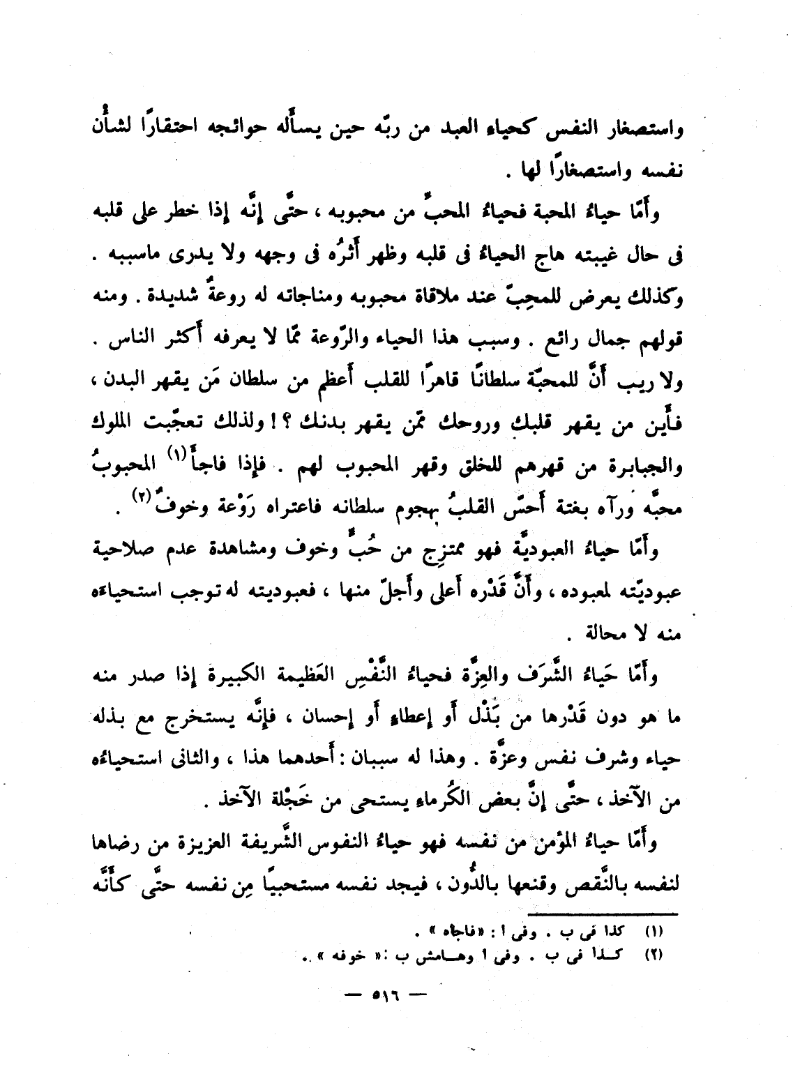 وأَمّا حياءُ المحبة فحياءُ المحبِّ من محبوبه، حتَّى إِنَّه إِذا خطر على قلبه فى حال غيبته هاج الحياءُ فى قلبه وظهر أَثرُه فى وجهه ولا يدرى ما سببه. وكذلك يعرض للمحِبّ عند ملاقاة محبوبه ومناجاته له روعةٌ شديدة. ومنه قولهم جمال رائع. وسبب هذا الحياء والرّوعة ممّا لا يعرفه أَكثر الناس. ولا ريب أَنَّ للمحبّة سلطاناً قاهراً للقلب أَعظم من سلطان مَن يقهر البدن، فأَين من يقهر قلبك وروحك ممّن يقهر بدنك؟! ولذلك تعجّبت الملوك والجبابرة من قهرهم للخلق وقهر المحبوب لهم. فإِذا فاجأَ المحبوبُ محبَّه ورآه بغتة أَحسّ القلبُ بهجوم سلطانه فاعتراه رَوْعة وخوفٌ.