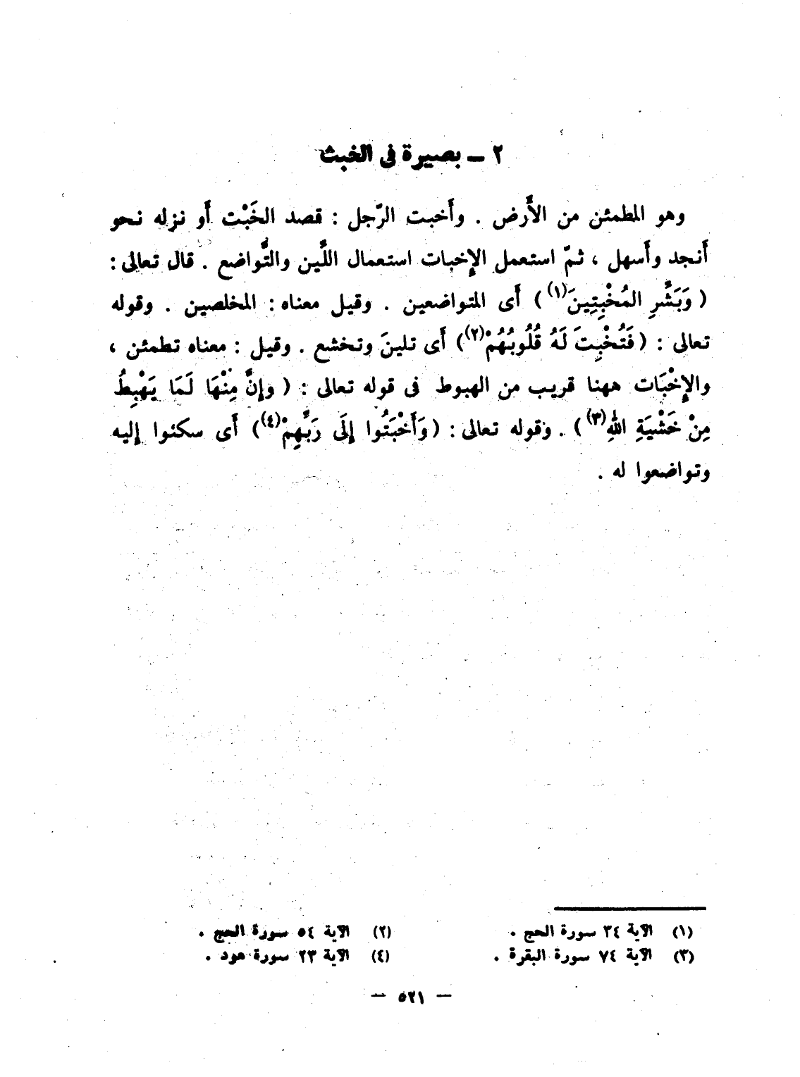 وهو المطمئن من الأَرض. وأَخبت الرّجل. قصد الخَبْت أَو نزله نحو أَنجد وأَسهل، ثمّ استعمل الإِخبات استعمال اللِّين والتَّواضع. قال تعالى: {وَبَشِّرِ المخبتين} أَى المتواضعين. وقيل معناه: المخلصين. وقوله تعالى: {فَتُخْبِتَ لَهُ قُلُوبُهُمْ} أَى تلينَ وتخشع. وقيل: معناه تطمئن، والإِخْبَات ههنا قريب من الهبوط فى قوله تعالى: {وَإِنَّ مِنْهَا لَمَا يَهْبِطُ مِنْ خَشْيَةِ الله} . وقوله تعالى: {وأخبتوا إلى رَبِّهِمْ} أَى سكنوا إِليه وتواضعوا له.