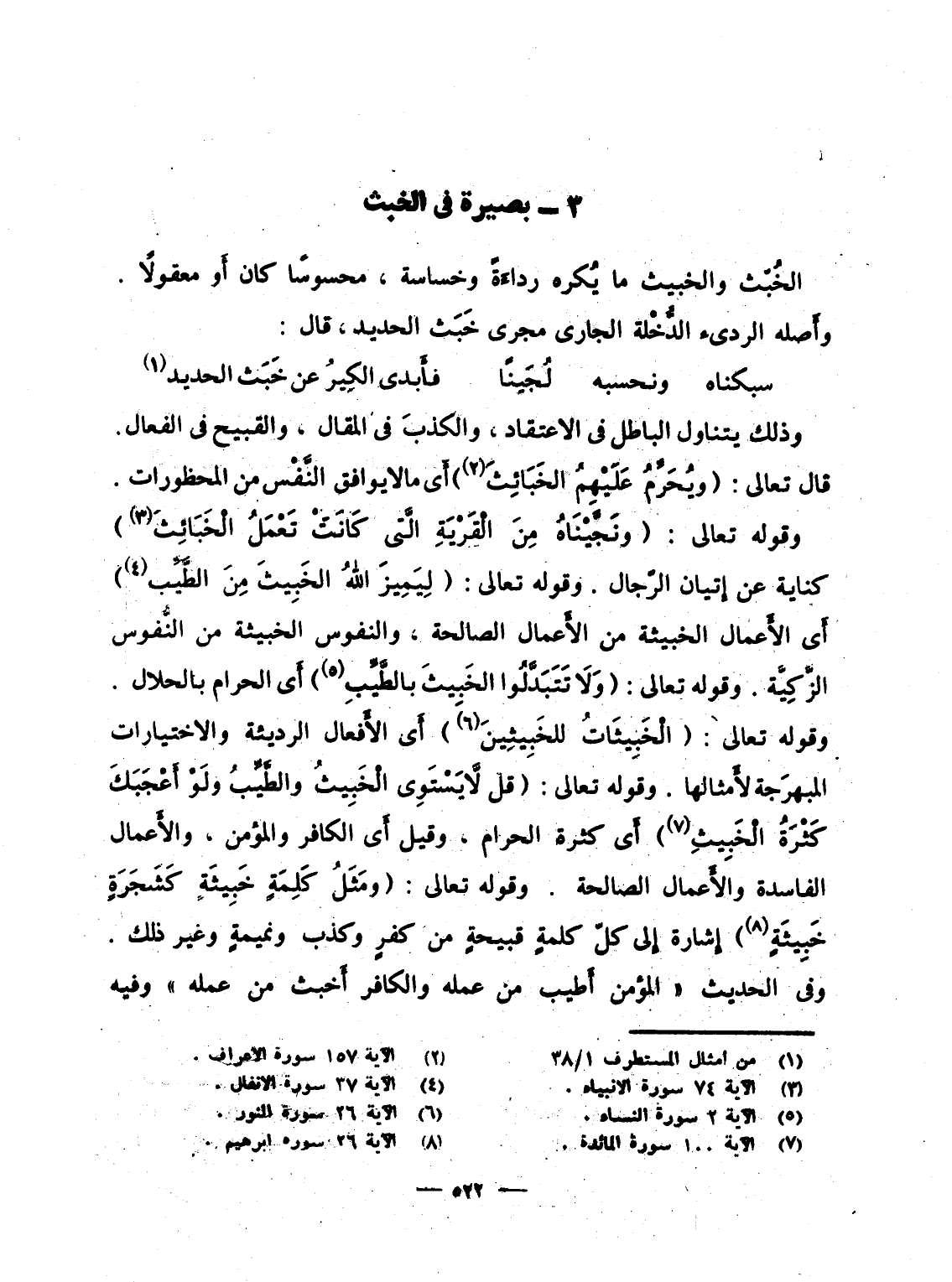 وقوله تعالى: {وَنَجَّيْنَاهُ مِنَ القرية التي كَانَت تَّعْمَلُ الخبائث} كناية عن إِتيان الرّجال. وقوله تعالى: {لِيَمِيزَ الله الخبيث مِنَ الطيب} أَى الأَعمال الخبيثة من الأَعمال الصالحة، والنفوس الخبيثة من النُّفوس الزَّكِيَّة. وقوله تعالى: {وَلاَ تَتَبَدَّلُواْ الخبيث بالطيب} أَى الحرام بالحلال. وقوله تعالى: {الخبيثات لِلْخَبِيثِينَ} أَى الأَفعال الرديئة والاختيارات المبهرَجة لأَمثالها. وقوله تعالى: {قُل لاَّ يَسْتَوِي الخبيث والطيب وَلَوْ أَعْجَبَكَ كَثْرَةُ الخبيث} أَى كثرة الحرام، وقيل أَى الكافر والمؤمن، والأَعمال الفاسدة والأَعمال الصالحة. وقوله تعالى: {وَمَثلُ كَلِمَةٍ خَبِيثَةٍ كَشَجَرَةٍ خَبِيثَةٍ} إِشارة إِلى كلّ كلمةٍ قبيحةٍ من كفر وكذب ونميمةٍ وغير ذلك. وفى الحديث "المؤمن أَطيب من عمله والكافر أَخبث من عمله" وفيه