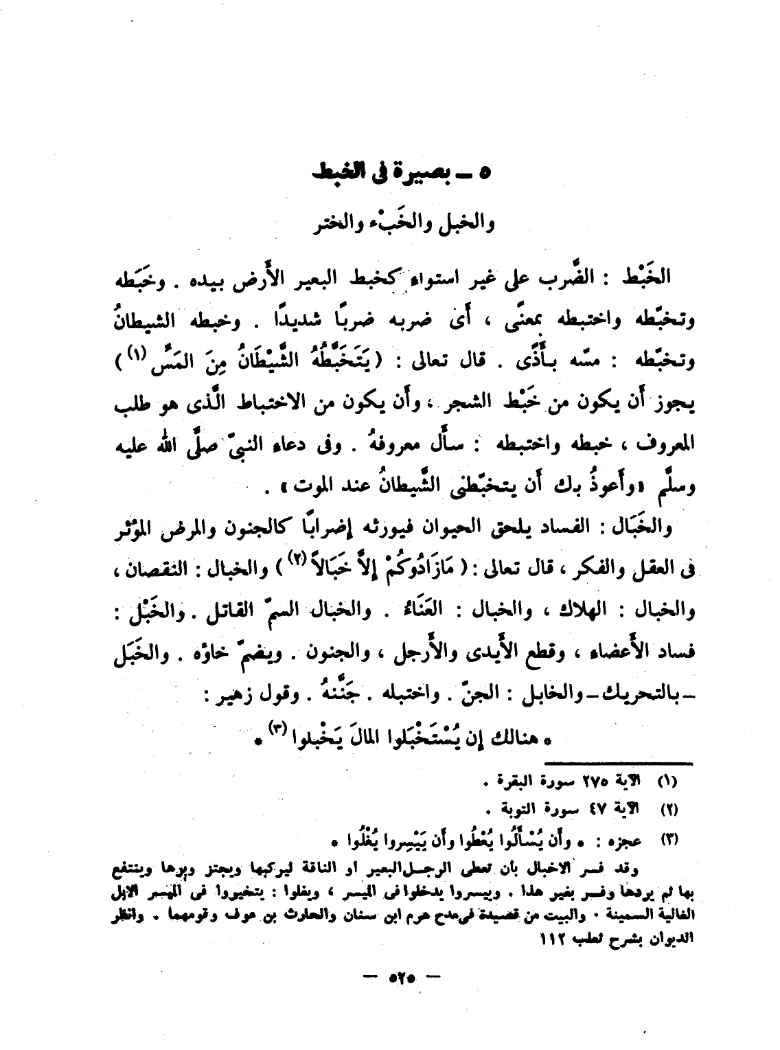الخَبْط: الضَّرب على غير استواءِ كخبط البعير الأَرض بيده. وخَبَطه وتخبّطه واختبطه بمعنىً، أَى ضربه ضرباً شديداً. وخبطه الشيطانُ وتخبّطه: مسّه بأَذًى. قال تعالى: {يَتَخَبَّطُهُ الشيطان مِنَ المس} يجوز أَن يكون من خَبْط الشجر، وأَن يكون من الاختباط الَّذى هو طلب المعروف، خبطه واختبطه: سأَل معروفهُ. وفى دعاءِ النبىّ صلَّى الله عليه وسلَّم "وأَعوذُ بك أَن يتخبّطنى الشَّيطانُ عند الموت".