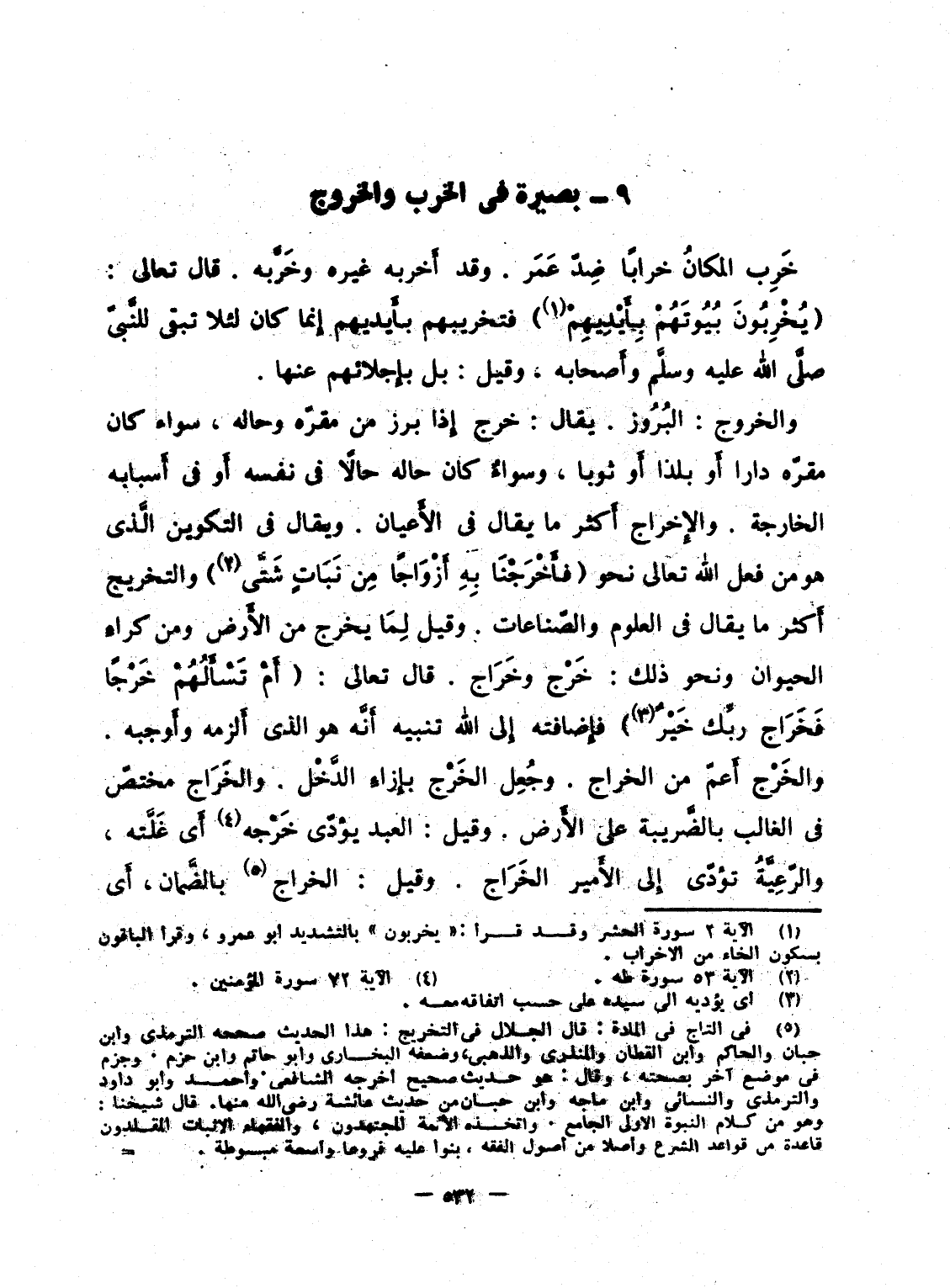 والخروج: البُرُوز. يقال: خرج إِذا برز من مقرّه وحاله، سواء كان مقرّه دارا أَو بلدا أَو ثوبا، وسواءٌ كان حاله حالاً فى نفسه أَو فى أَسبابه الخارجة. والإِخراج أَكثر ما يقال فى الأَعيان. ويقال فى التكوين الَّذى هو من فعل الله تعالى نحو {فَأَخْرَجْنَا بِهِ أَزْوَاجاً مِّن نَّبَاتٍ شتى} والتخريج أَكثر ما يقال فى العلوم والصّناعات. وقيل لِمَا يخرج من الأَرض ومن كراءِ الحيوان ونحو ذلك: خَرْج وخَرَاج. قال تعالى: {أَمْ تَسْأَلُهُمْ خَرْجاً فَخَرَاجُ رَبِّكَ خَيْرٌ} فإِضافته إِلى الله تنبيه أَنَّه هو الذى أَلزمه وأَوجبه. والخَرْج أَعمّ من الخراج. وجُعِل الخَرْج بإِزاءِ الدَّخْل. والخَرَاج مختصّ فى الغالب بالضَّريبة على الأَرض. وقيل: العبد يؤدّى خَرْجه أَى غَلَّته، والرّعِيَّةُ تؤدّى إِلى الأَمير الخَرَاج. وقيل: الخراج بالضَّمان، أَى