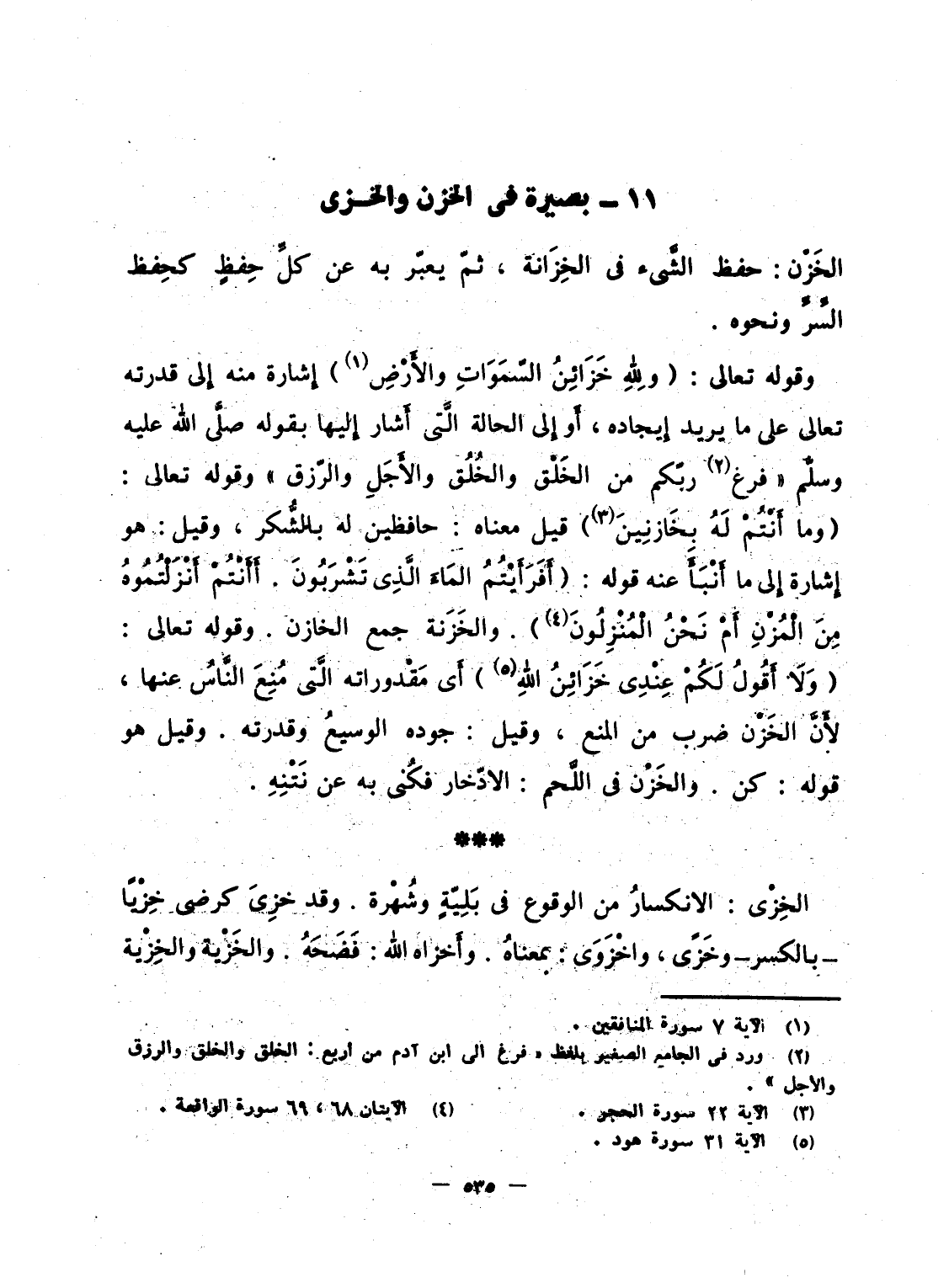 وقوله تعالى: {وَلِلَّهِ خَزَآئِنُ السماوات والأرض} إِشارة منه إِلى قدرته تعالى على ما يريد إِيجاده، أَو إِلى الحالة الَّتى أَشار إِليها بقوله صلَّى الله عليه وسلَّم "فرغ ربّكم من الخَلْق والخُلُق والأَجَلِ والرّزق" وقوله تعالى: {وَمَآ أَنْتُمْ لَهُ بِخَازِنِينَ} قيل معناه: حافظين له بالشُّكر، وقيل: هو إِشارة إِلى ما أَنبَأَ عنه قوله: {أَفَرَأَيْتُمُ المآء الذي تَشْرَبُونَ. أَأَنتُمْ أَنزَلْتُمُوهُ مِنَ المزن أَمْ نَحْنُ المنزلون} . والخَزَنة جمع الخازن. وقوله تعالى: {وَلاَ أَقُولُ لَكُمْ عِندِي خَزَآئِنُ الله} أَى مَقْدوراته الَّتى مُنِعَ النَّاسُ عنها، لأَنَّ الخَزْن ضرب فى المنع. وقيل: جوده الوسيعُ وقدرته. وقيل هو قوله: كن. والخَزْن فى اللَّحم: الادّخار فكُنى به عن نَتْنِهِ.