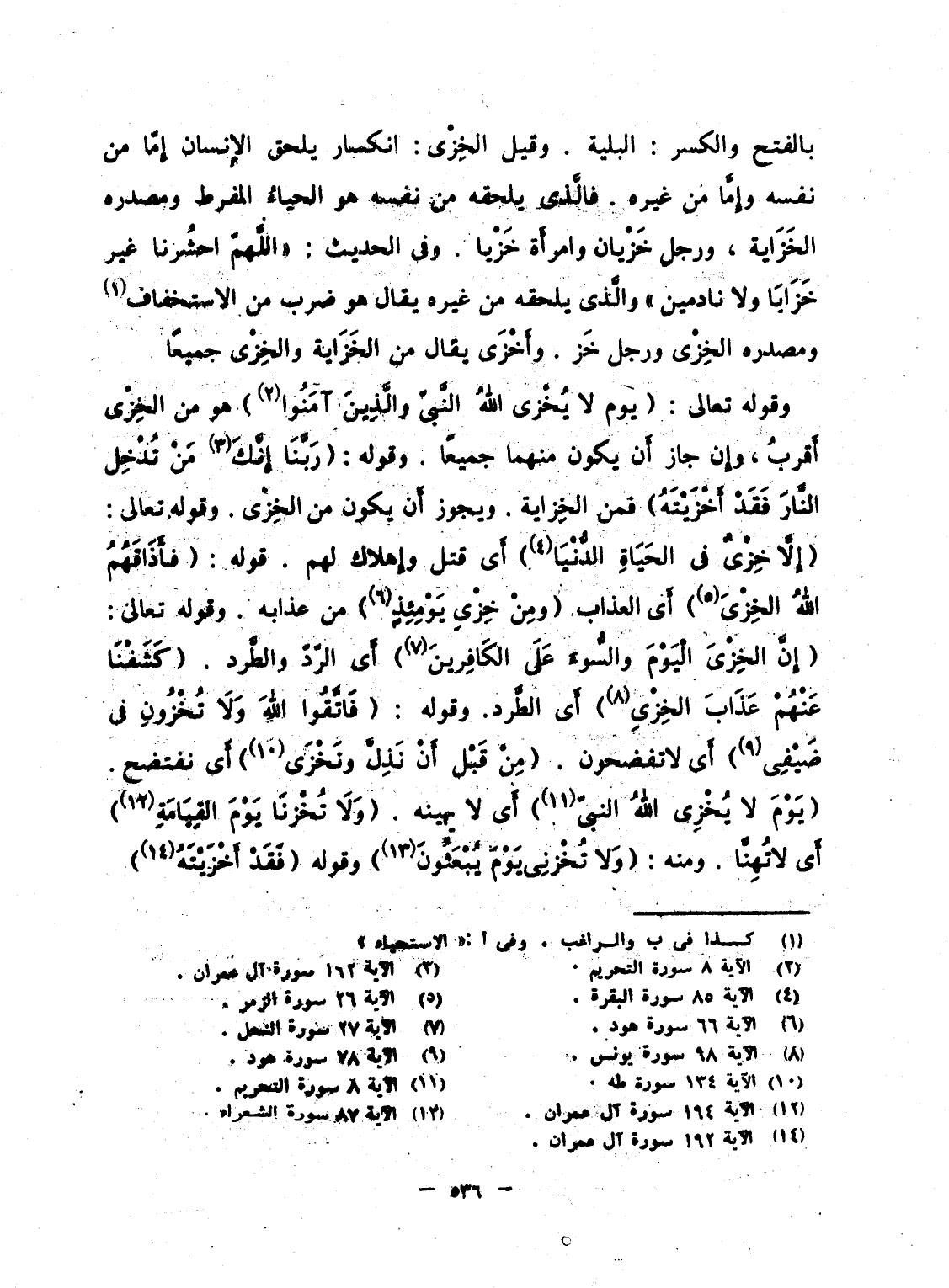 وقوله تعالى: {يَوْمَ لاَ يُخْزِى الله النبي والذين آمَنُواْ} هو من الخِزْى أَقربُ، وإِن جاز أَن يكون منهما جميعاً. وقوله: {رَبَّنَآ إِنَّكَ مَن تُدْخِلِ النار فَقَدْ أَخْزَيْتَهُ} فمن الخِزاية. ويجوز أَن يكون من الخِزْى. وقوله تعالى: {إِلاَّ خِزْيٌ فِي الحياة الدنيا} أَى قتل وإِهلاك لهم. قوله: {فَأَذَاقَهُمُ الله الخزي} أَى العذاب {وَمِنْ خِزْيِ يَوْمِئِذٍ} من عذابه. وقوله تعالى: {إِنَّ الخزي اليوم والسواء عَلَى الكافرين} أَى الرّدّ والطَّرد. {كَشَفْنَا عَنْهُمْ عَذَابَ الخزي} أَى الطَّرد. وقوله: {فَاتَّقُواْ اللًّهَ وَلاَ تُخْزُونِ فِي ضَيْفِي} أَى لا تفضحون. {مِن قَبْلِ أَن نَّذِلَّ ونخزى} أَى نفتضح. {يَوْمَ لاَ يُخْزِى الله النبي} أَى لا يهينه. {وَلاَ تُخْزِنَا يَوْمَ القيامة} أَى لا تُهِنَّا. ومنه: {وَلاَ تُخْزِنِي يَوْمَ يُبْعَثُونَ} وقوله {فَقَدْ أَخْزَيْتَهُ} .
