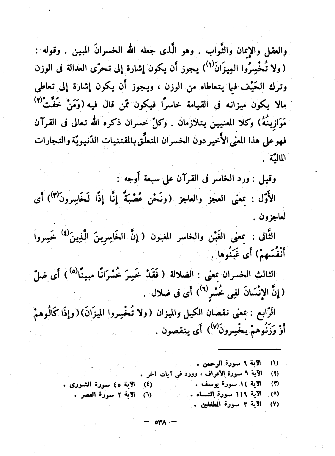 والعقل والإِيمان والثَّواب. وهو الَّذى جعله الله الخسرانَ المبين. وقوله: {وَلاَ تُخْسِرُواْ الميزان} يجوز أَن يكون إِشارة إِلى تحرّى العدالة فى الوزن وترك الحَيْف فيما يتعاطاه من الوزن، ويجوز أَن يكون إِشارة إِلى تعاطى مالا يكون ميزانه فى القيامة خاسراً فيكون ممّن قال فيه {وَمَنْ خَفَّتْ مَوَازِينُهُ} وكلا المعنيين يتلازمان. وكلّ خسران ذكره الله تعالى فى القرآن فهو على هذا المعنى الأَخير دون الخسران المتعلِّق بالمقتنيات الدّنيويّة والتجارات الماليّة.