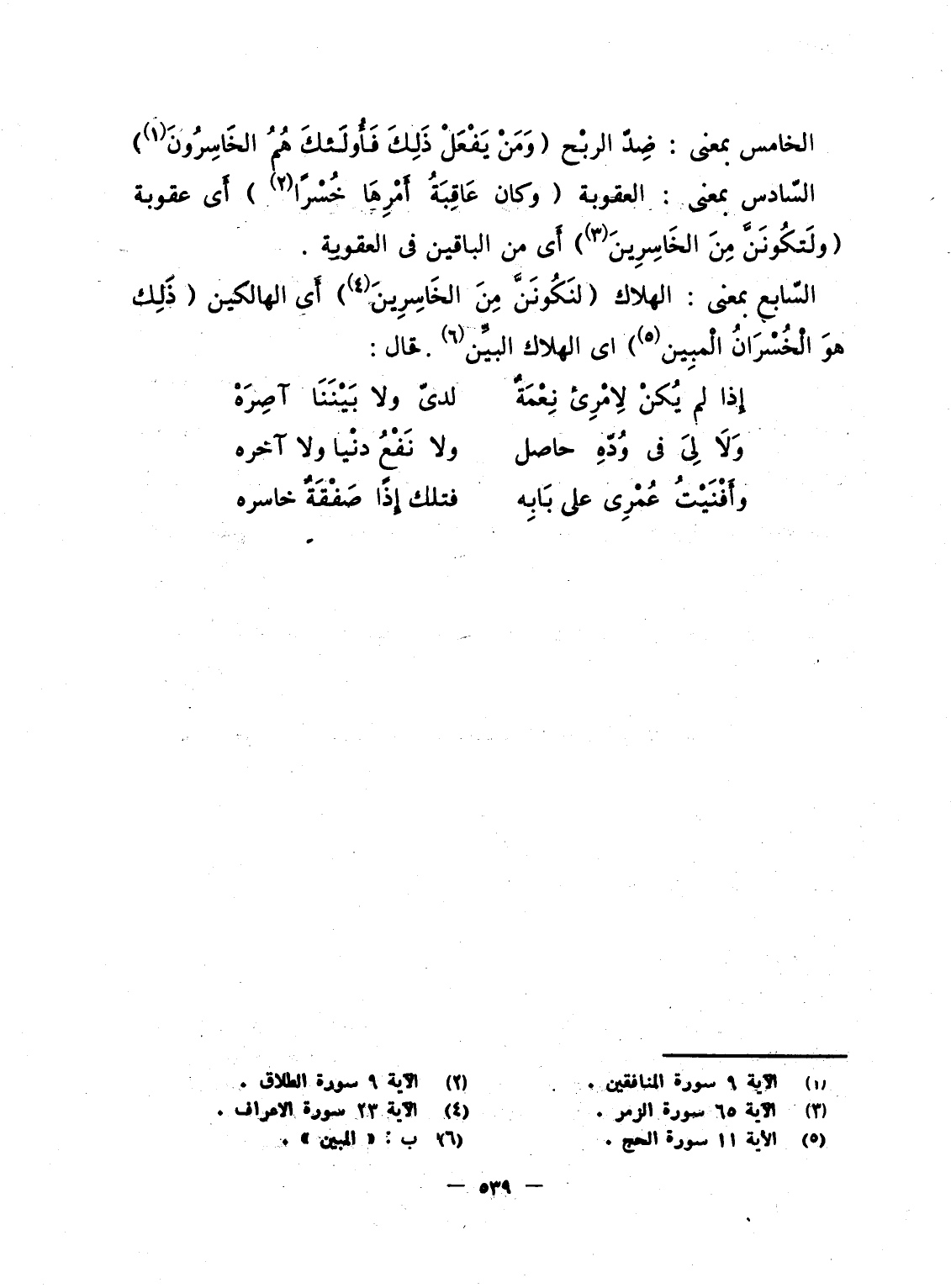 الخامس بمعنى: ضِدّ الربْح {وَمَن يَفْعَلْ ذَلِكَ فأولائك هُمُ الخاسرون} .