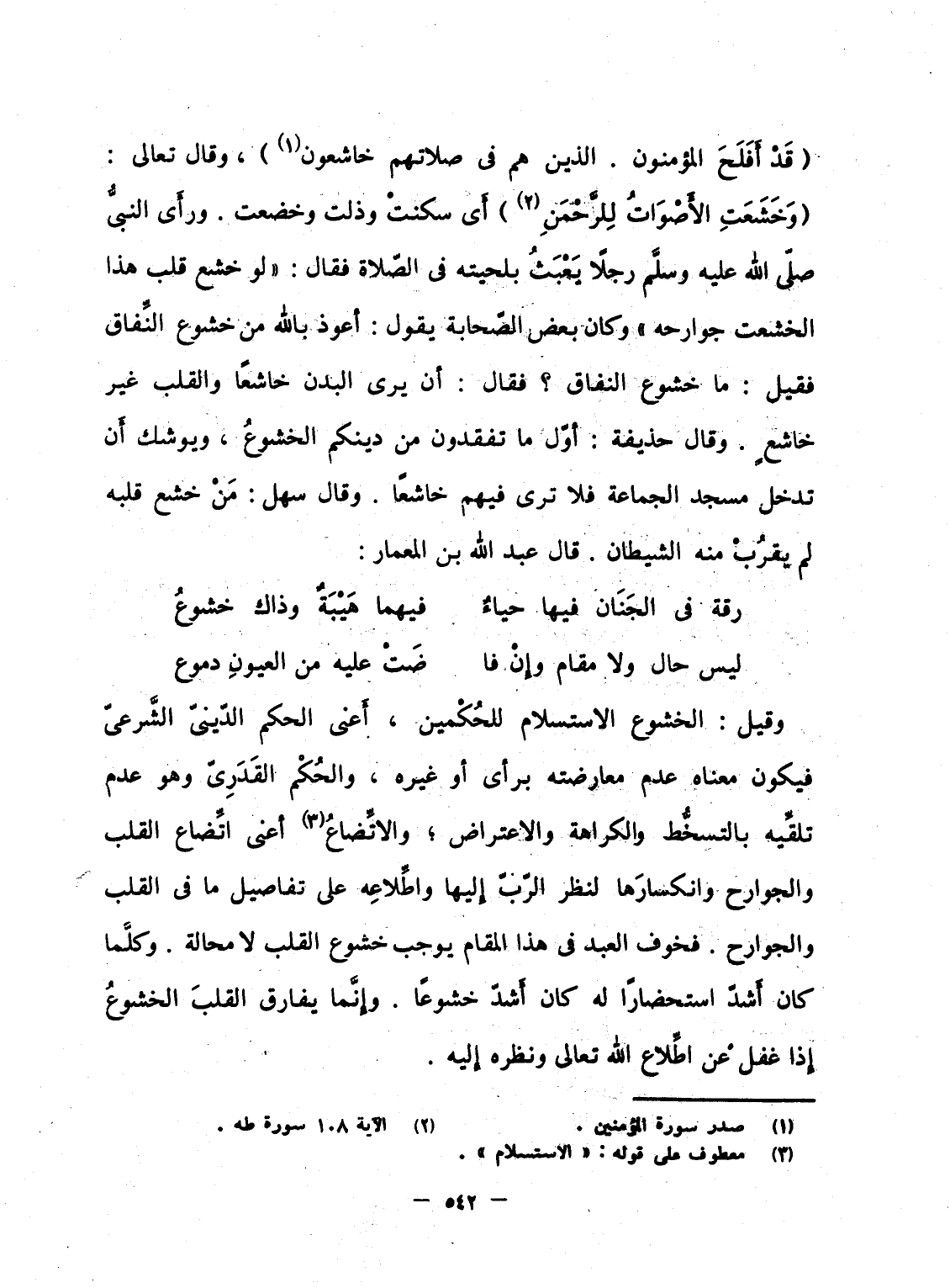 {قَدْ أَفْلَحَ المؤمنون. الذين هُمْ فِي صَلاَتِهِمْ خَاشِعُونَ} ، وقال تعالى: {وَخَشَعَتِ الأصوات للرحمان} أَى سكنتْ وذلت وخضعت. ورأَى النبىُّ صلّى الله عليه وسلَّم رجلاً يَعْبَثُ بلحيته فى الصّلاة فقال: "لو خشع قلب هذا لخشعت جوارحه" وكان بعض الصّحابة يقول: أعوذ بالله من خشوع النِّفاق فقيل: ما خشوع النفاق؟ فقال: أن يرى البدن خاشعاً والقلب غير خاشعٍ. وقال حذيفة: أوّل ما تفقدون من دينكم الخشوعُ، ويوشك أَن تدخل مسجد الجماعة فلا ترى فيهم خاشعاً. وقال سهل: مَنْ خشع قلبه لم يقرُبْ منه الشيطان. قال عبد الله بن المعمار: