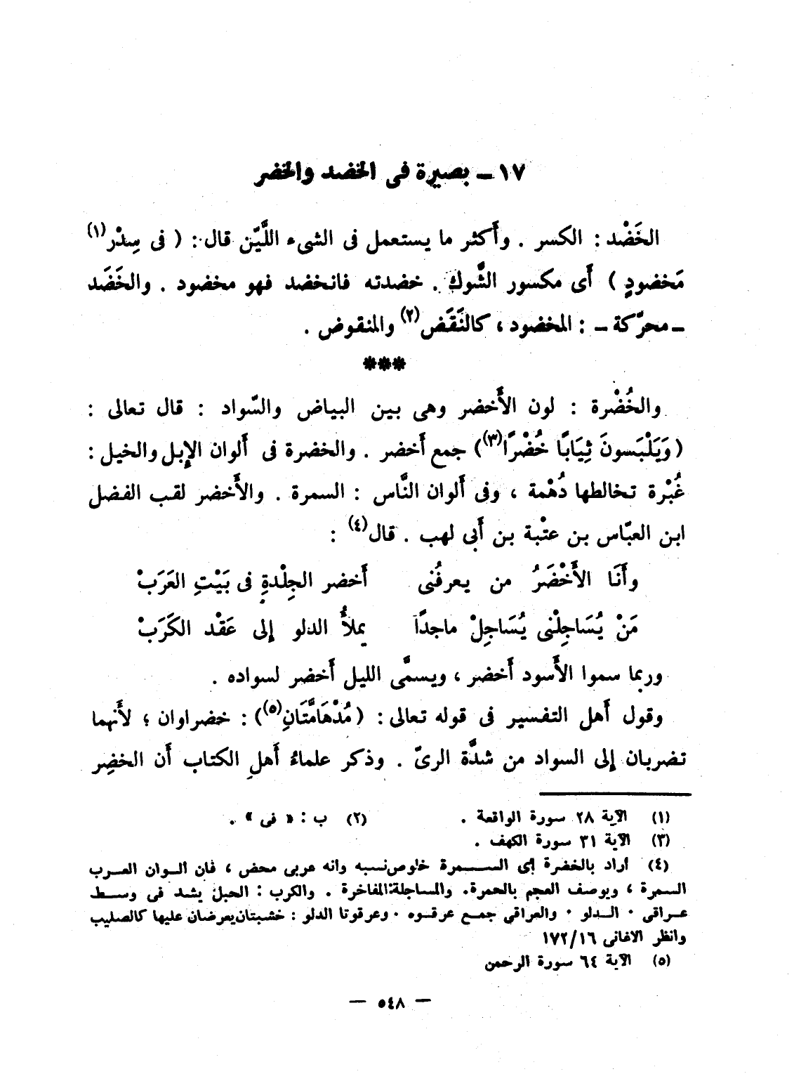 وقول أَهل التفسير فى قوله تعالى: {مُدْهَآمَّتَانِ} : خضراوان؛ لأَنهما تضربان إِلى السواد من شدَّة الرىّ. وذكر علماءُ أَهل الكتاب أَن الخضِر