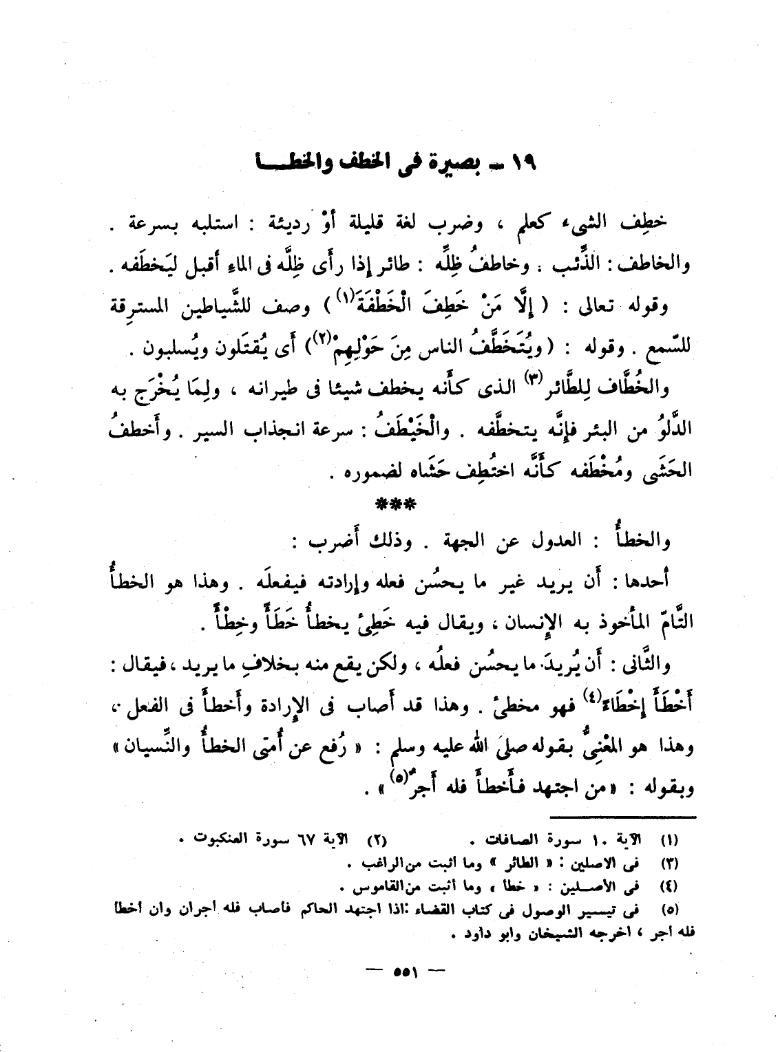 والثَّانى: أَن يُريدَ ما يحسُن فعلُه، ولكن يقع منه بخلافِ ما يريد، فيقال: أَخْطَأَ إِخْطَاءً فهو مخطئ. وهذا قد أَصاب فى الإِرادة وأَخطأَ فى الفعل، وهذا هو المعْنِىُّ بقوله صلى الله عليه وسلم: "رُفع عن أُمتى الخطأُ والنِّسيان" وبقوله: "من اجتهد فأَخطأَ فله أَجرٌ".