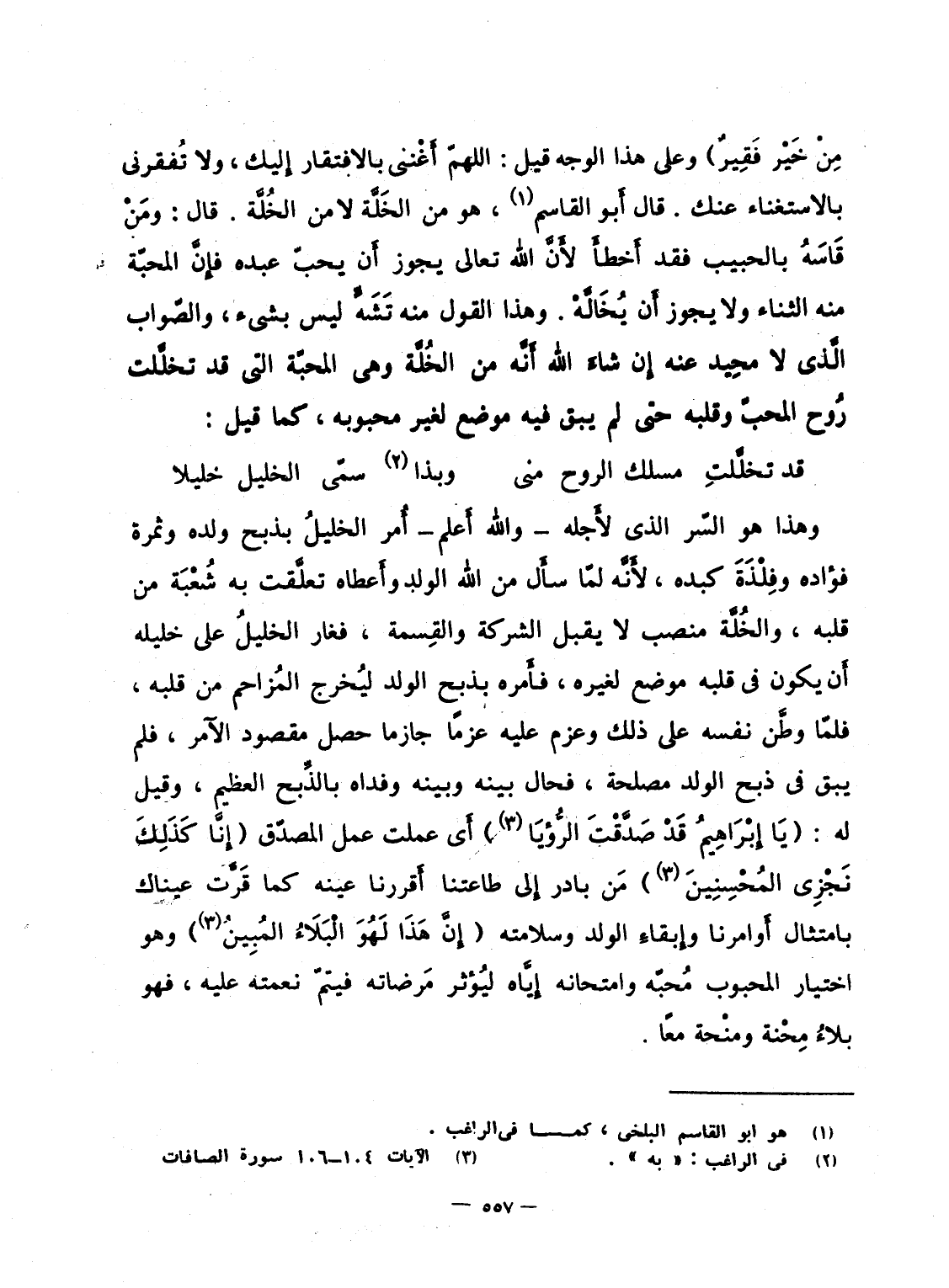 مِنْ خَيْرٍ فَقِيرٌ} وعلى هذا الوجه قيل: اللهمّ أَغْننى بالافتقار إِليك، ولا تُفقرنى بالاستغناء عنك. قال أَبو القاسم، هو من الخَلَّة لا من الخُلَّة. قال: ومَنْ قَاسَهُ بالحبيب فقد أَخطأَ لأَنَّ الله تعالى يجوز أَن يحبّ عبده فإِنَّ المحبّة منه الثناء ولا يجوز أَن يُخَالَّهْ. وهذا القول منه تَشَهٍّ ليس بشئ، والصّواب الَّذى لا محِيد عنه إِن شاءَ الله أَنَّه من الخُلَّة وهى المحبّة التى قد تخلَّلت رُوح المحبّ وقلبه حتى لم يبق فيه موضع لغير محبوبه، كما قيل: