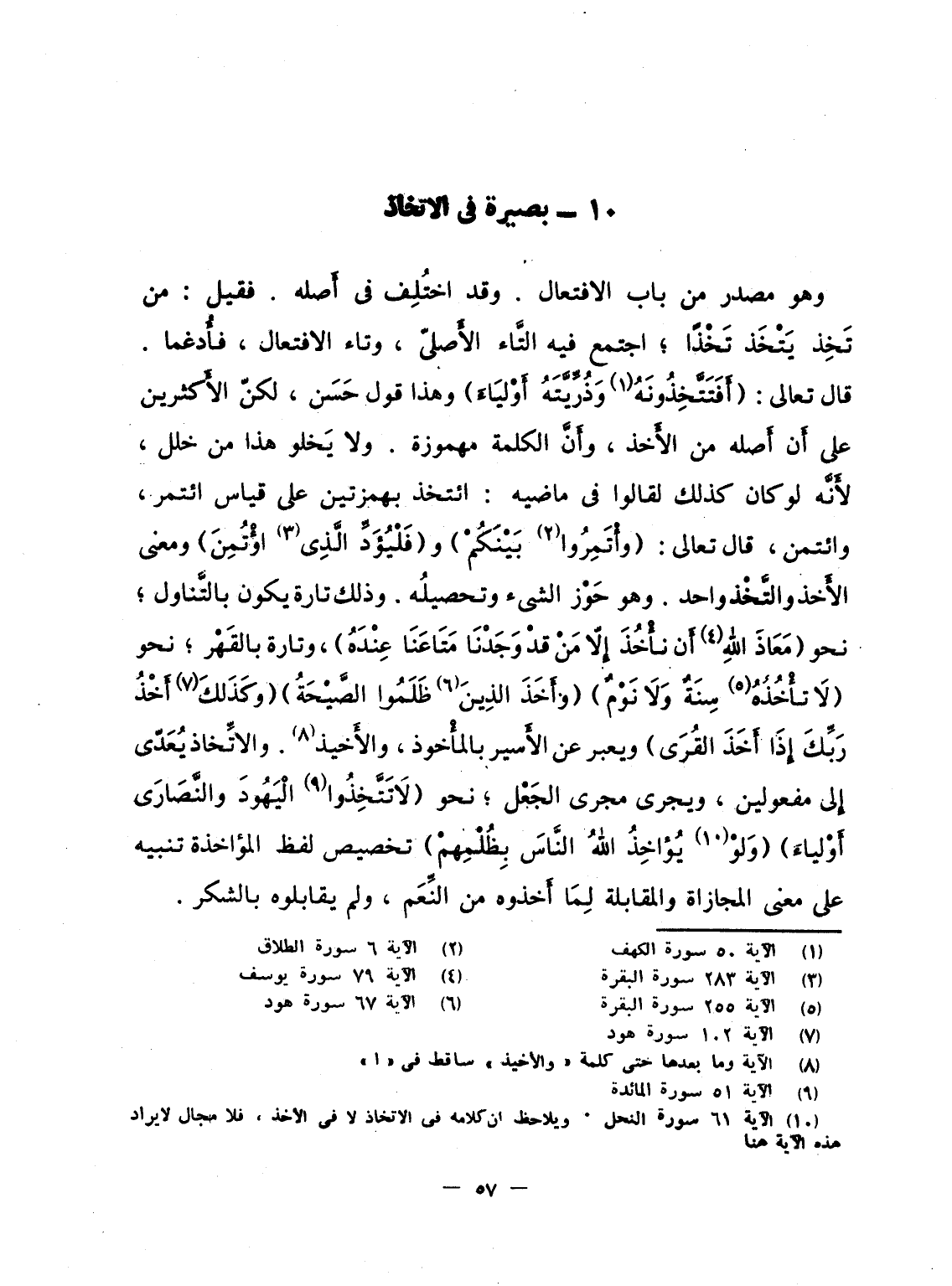 وهو مصدر من باب الافتعال. وقد اختُلِف فى أَصله. فقيل: من تَخِذ يَتْخَذ تَخْذاً؛ اجتمع فيه التَّاء الأَصلىّ، وتاء الافتعال، فأُدغما. قال تعالى: {أَفَتَتَّخِذُونَهُ وَذُرِّيَّتَهُ أَوْلِيَآءَ} وهذا قول حَسَن، لكنّ الأَكثرين على أَن أَصله من الأَخذ، وأَنَّ الكلمة مهموزة. ولا يَخلو هذا من خلل، لأَنَّه لو كان كذلك لقالوا فى ماضيه: ائتخذ بهمزتين على قياس ائتمر، وائتمن، قال تعالى: {وَأْتَمِرُواْ بَيْنَكُمْ} و {فَلْيُؤَدِّ الذي اؤتمن} ومعنى الأَخذ والتَّخْذ واحد. وهو حَوْز الشئ وتحصيلُه. وذلك تارة يكون بالتَّناول؛ نحو {مَعَاذَ الله أَن نَّأْخُذَ إِلاَّ مَن وَجَدْنَا مَتَاعَنَا عِندَهُ} ، وتارة بالقَهْر؛ نحو {لاَ تَأْخُذُهُ سِنَةٌ وَلاَ نَوْمٌ} {وَأَخَذَ الذين ظَلَمُواْ الصيحة} {وكذلك أَخْذُ رَبِّكَ إِذَا أَخَذَ القرى} ويعبر عن الأَسير بالمأْخوذ، والأَخيذ. والاتِّخاذ يُعَدّى إِلى مفعولين، ويجرى مجرى الجَعْل؛ نحو {لاَ تَتَّخِذُواْ اليهود والنصارى أَوْلِيَآءَ} {وَلَوْ يُؤَاخِذُ الله الناس بِظُلْمِهِمْ} تخصيص لفظ المؤاخذة تنبيه على معنى المجازاة والمقابلة لِمَا أَخذوه من النِّعَم، ولم يقابلوه بالشكر.