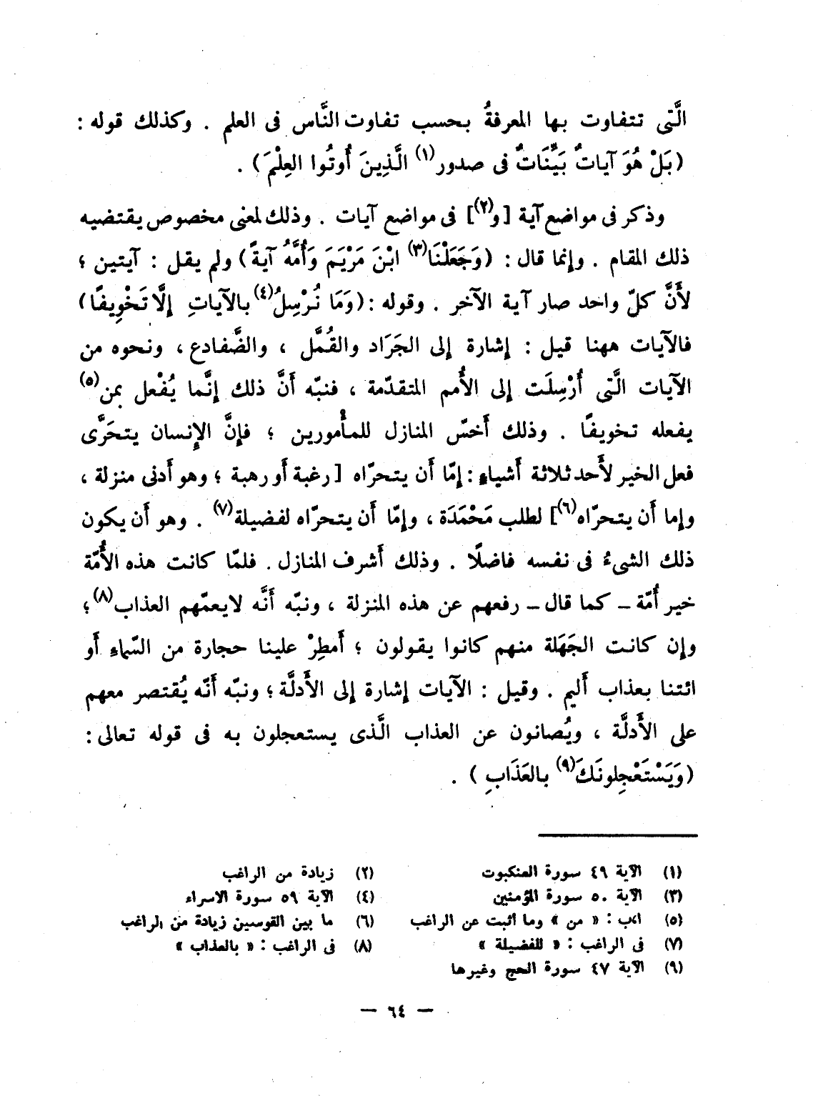 وذكر فى مواضع آية [و] فى مواضع آيات. وذلك لمعنى مخصوص يقتضيه ذلك المقام. وإِنما قال: {وَجَعَلْنَا ابن مَرْيَمَ وَأُمَّهُ آيَةً} ولم يقل: آيتين؛ لأَنَّ كلّ واحد صار آية الآخر. وقوله: {وَمَا نُرْسِلُ بالآيات إِلاَّ تَخْوِيفاً} فالآيات ههنا قيل: إِشارة إِلى الجَرَاد والقُمَّل، والضَّفادع، ونحوه من الآيات الَّتى أُرْسِلَت إِلى الأُمم المتقدّمة، فنبّه أَنَّ ذلك إِنَّما يُفْعل بمن يفعله تخويفاً. وذلك أَخسّ المنازل للمأْمورين؛ فإِنَّ الإِنسان يتحَرَّى فعل الخير لأَحد ثلاثة أَشياءٍ: إِمّا أَن يتحرّاه [رغبة أَو رهبة؛ وهو أَدنى منزلة، وإِما أَن يتحرّاه] لطلب مَحْمَدَة، وإِمّا أَن يتحرّاه لفضيلة. وهو أَن يكون ذلك الشئُ فى نفسه فاضلاً. وذلك أَشرف المنازل. فلمّا كانت هذه الأُمّة خير أُمّة - كما قال - رفعهم عن هذه المنزلة، ونبّه أَنَّه لا يعمّهم العذاب؛ وإِن كانت الجَهَلة منهم كانوا يقولون؛ أَمطِرْ علينا حجارة من السّماءِ أَو ائتنا بعذاب أَليم. وقيل: الآيات إِشارة إِلى الأَدلَّة؛ ونبّه أَنّه يُقتصر معهم على الأَدلَّة، ويُصانون عن العذاب الَّذى يستعجلون به فى قوله تعالى: {وَيَسْتَعْجِلُونَكَ بالعذاب} .
