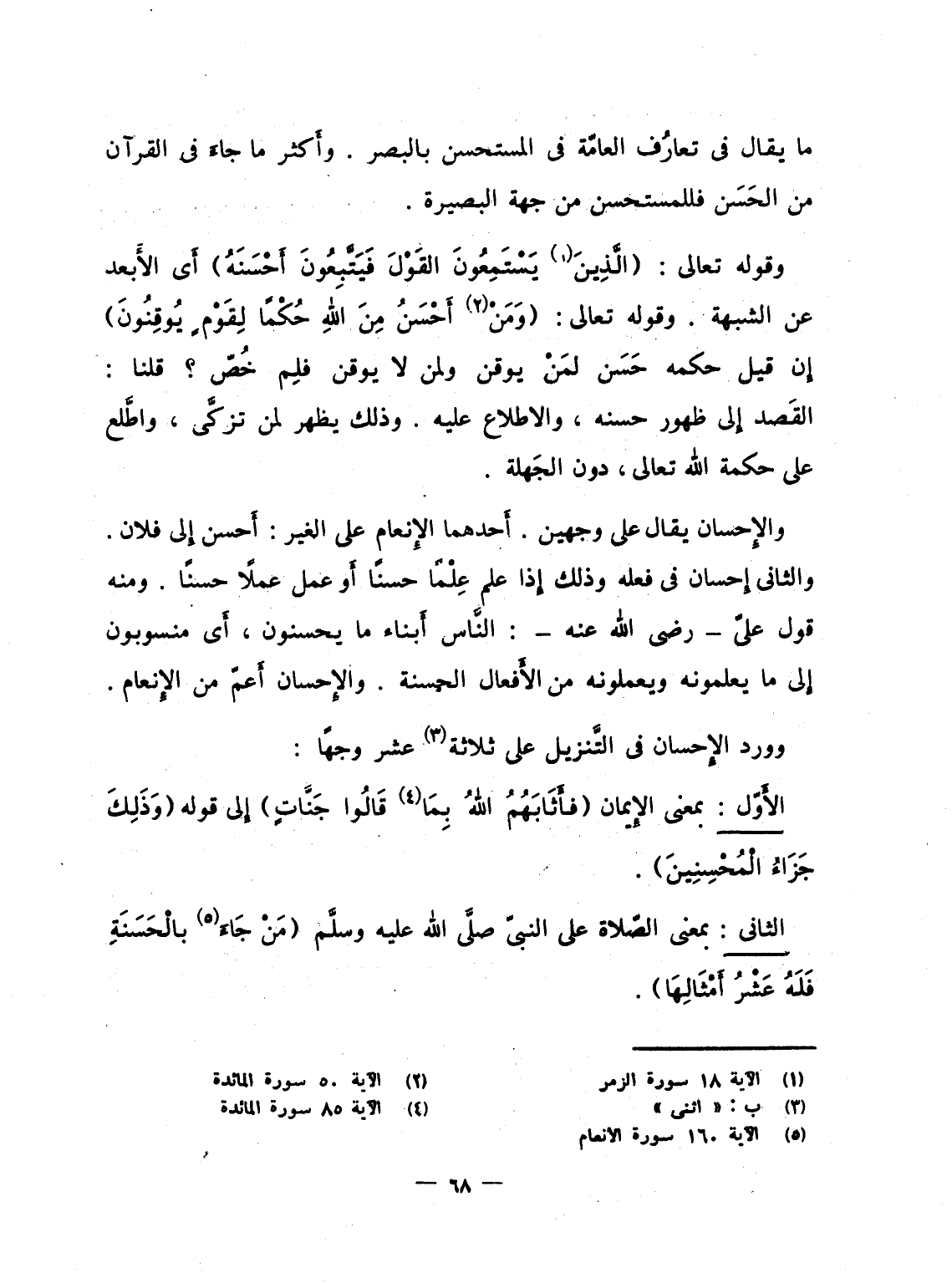 ما يقال فى تعارُف العامّة فى المستحسن بالبصر. وأَكثر ما جاءَ فى القرآن من الحَسَن فللمستحسن من جهة البصيرة.