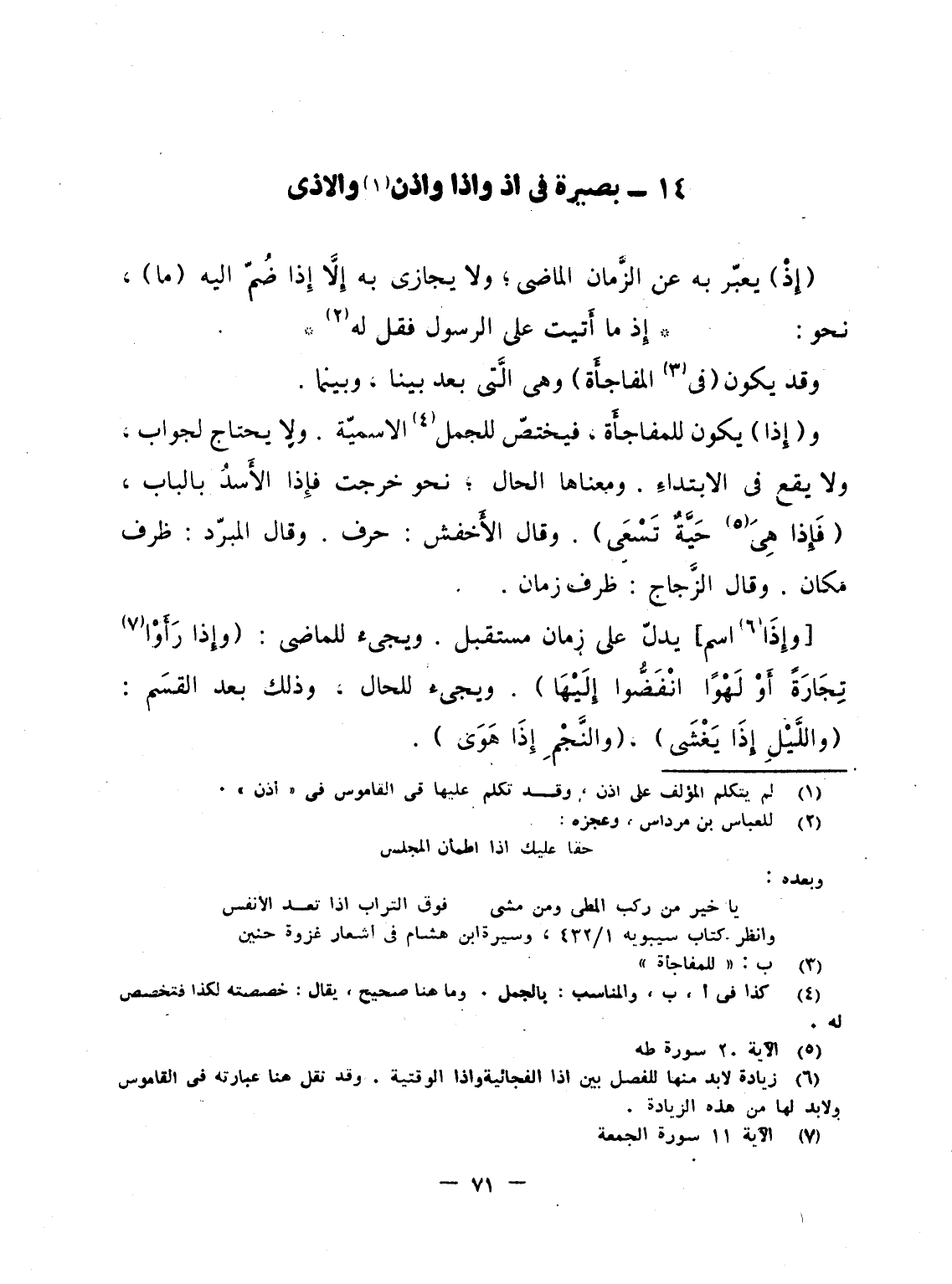 و (إِذا) يكون فى المفاجأَة، فيختصّ للجمل الاسميّة. ولا يحتاج لجواب، ولا يقع فى الابتداءِ. ومعناها الحال؛ نحو خرجت فإِذا الأَسدُ بالباب، {فَإِذَا هِيَ حَيَّةٌ تسعى} . وقال الأَخفش: حرف. وقال المبرّد: ظرف مكان. وقال الزَّجاج: ظرف زمان.