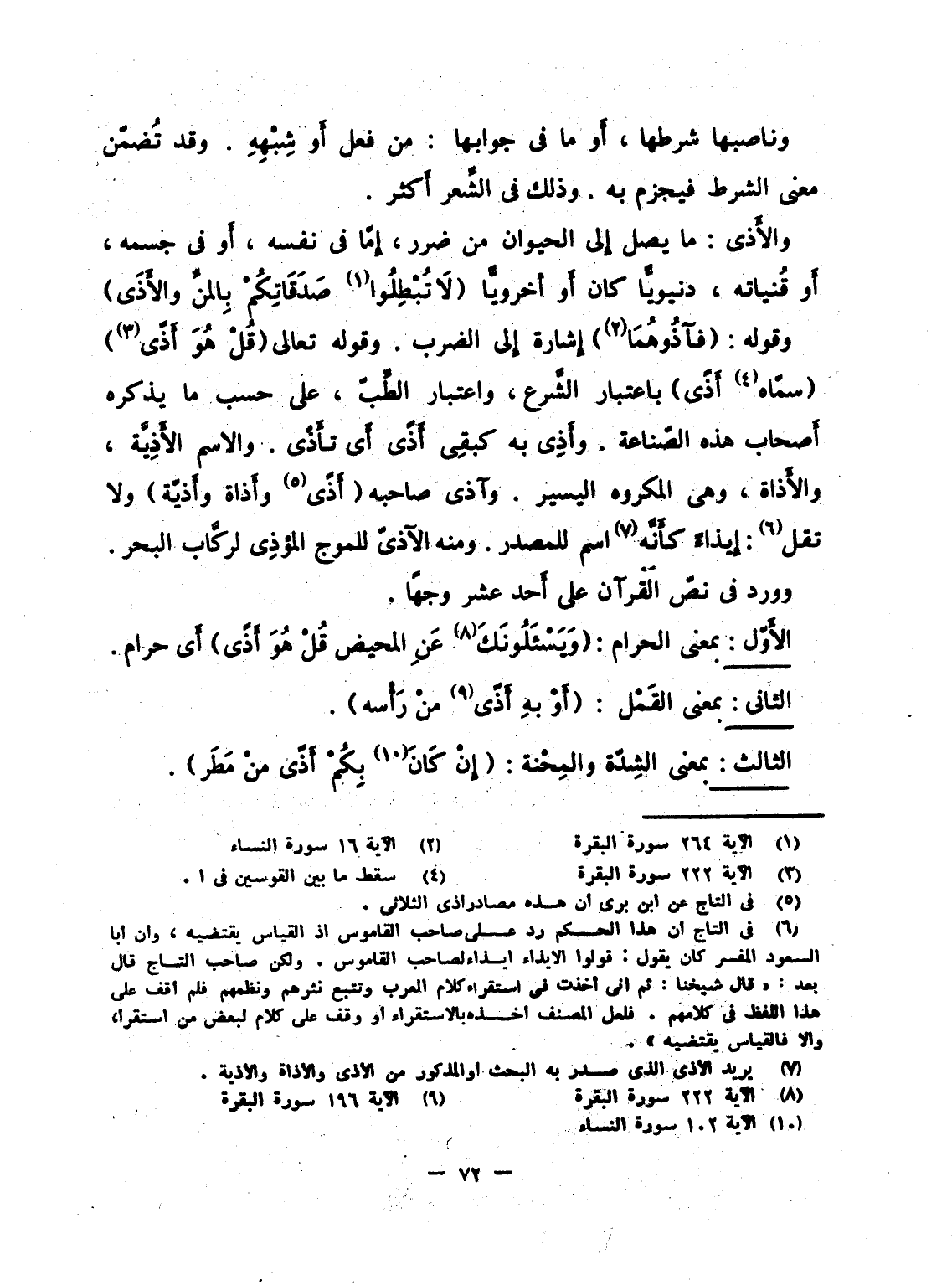 الأَوّل بمعنى الحرام: {وَيَسْأَلُونَكَ عَنِ المحيض قُلْ هُوَ أَذًى} . أَى حرام.