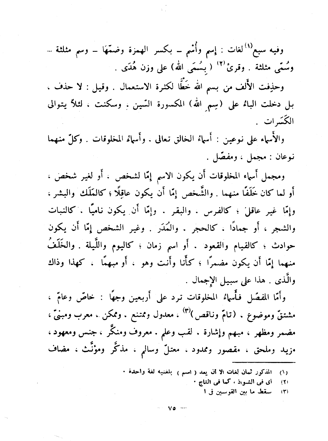 وأَمّا المفصّل فأَسماءُ المخلوقات ترد على أَربعين وجهاً: خاصّ وعامّ، مشتقّ وموضوع، (تامّ وناقص) ، معدول وممتنع، وممكن، معرب ومبنىّ، مضمر ومظهر، مبهم وإِشارة، لقب وعلم، معروف ومنكَّر، جنس ومعهود، مزيد وملحق، مقصور وممدود، معتلّ وسالم، مذكَّر ومؤنَّث، مضاف