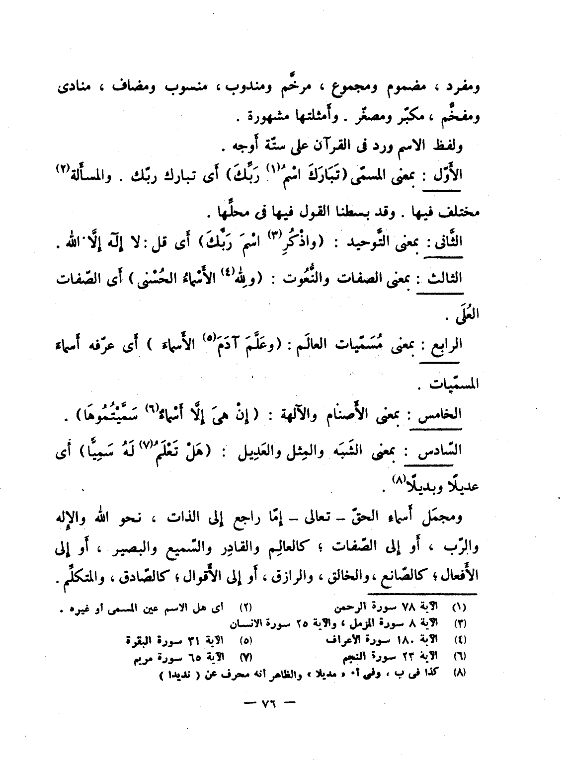 ومجمَل أَسماءِ الحقّ - تعالى - إِمّا راجع إِلى الذات، نحو الله والإِله والرّب، أَو إلى الصّفات؛ كالعالِم والقادِر والسّميع والبصير، أَو إِلى الأَفعال؛ كالصّانع، والخالق، والرازق، أَو إِلى الأَقوال؛ كالصّادق، والمتكلِّم.