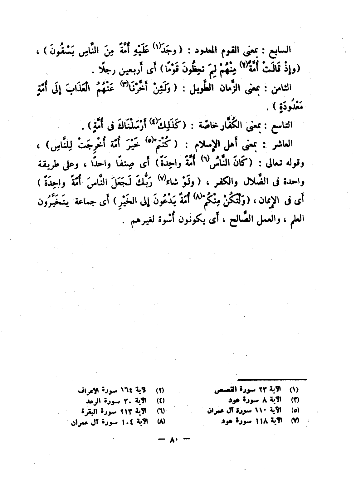 السابع: بمعنى القوم المعدود: {وَجَدَ عَلَيْهِ أُمَّةً مِّنَ الناس يَسْقُونَ} ، {وَإِذَا قَالَتْ أُمَّةٌ مِّنْهُمْ لِمَ تَعِظُونَ قَوْماً} أَى أَربعين رجلاً.