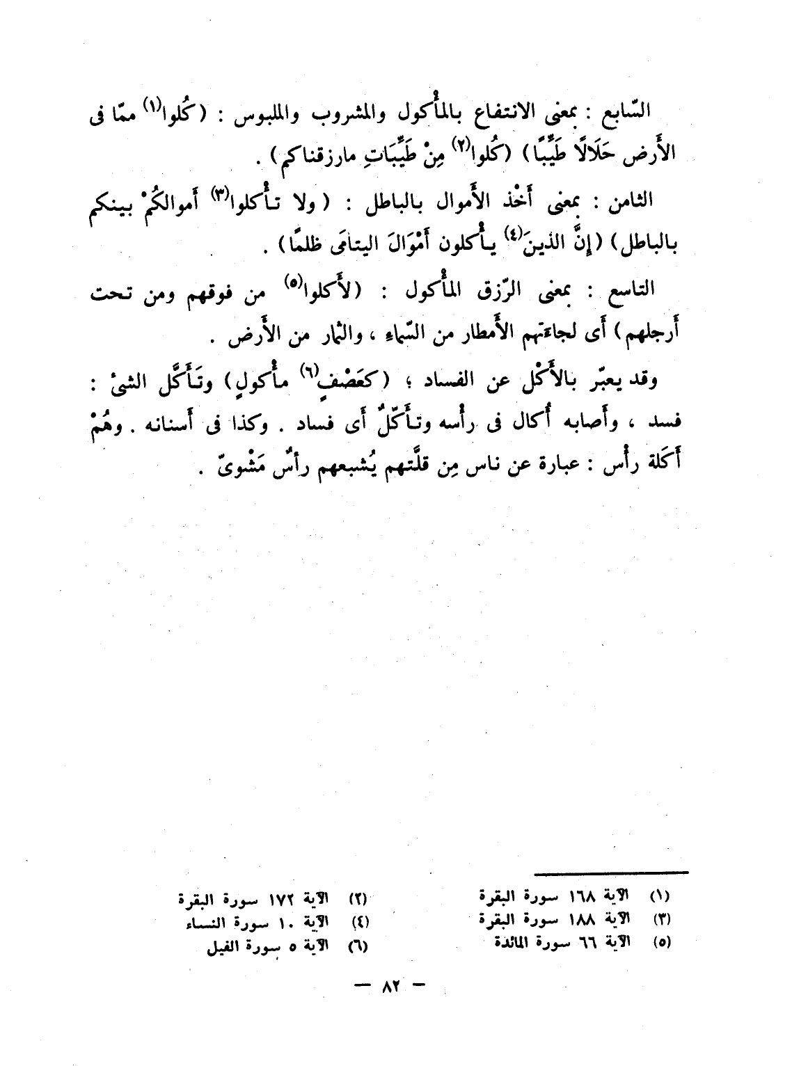 الثامن: بمعنى أَخْذ الأَموال بالباطل: {وَلاَ تأكلوا أَمْوَالَكُمْ بَيْنَكُمْ بالباطل} {إِنَّ الذين يَأْكُلُونَ أَمْوَالَ اليتامى ظُلْماً} .
