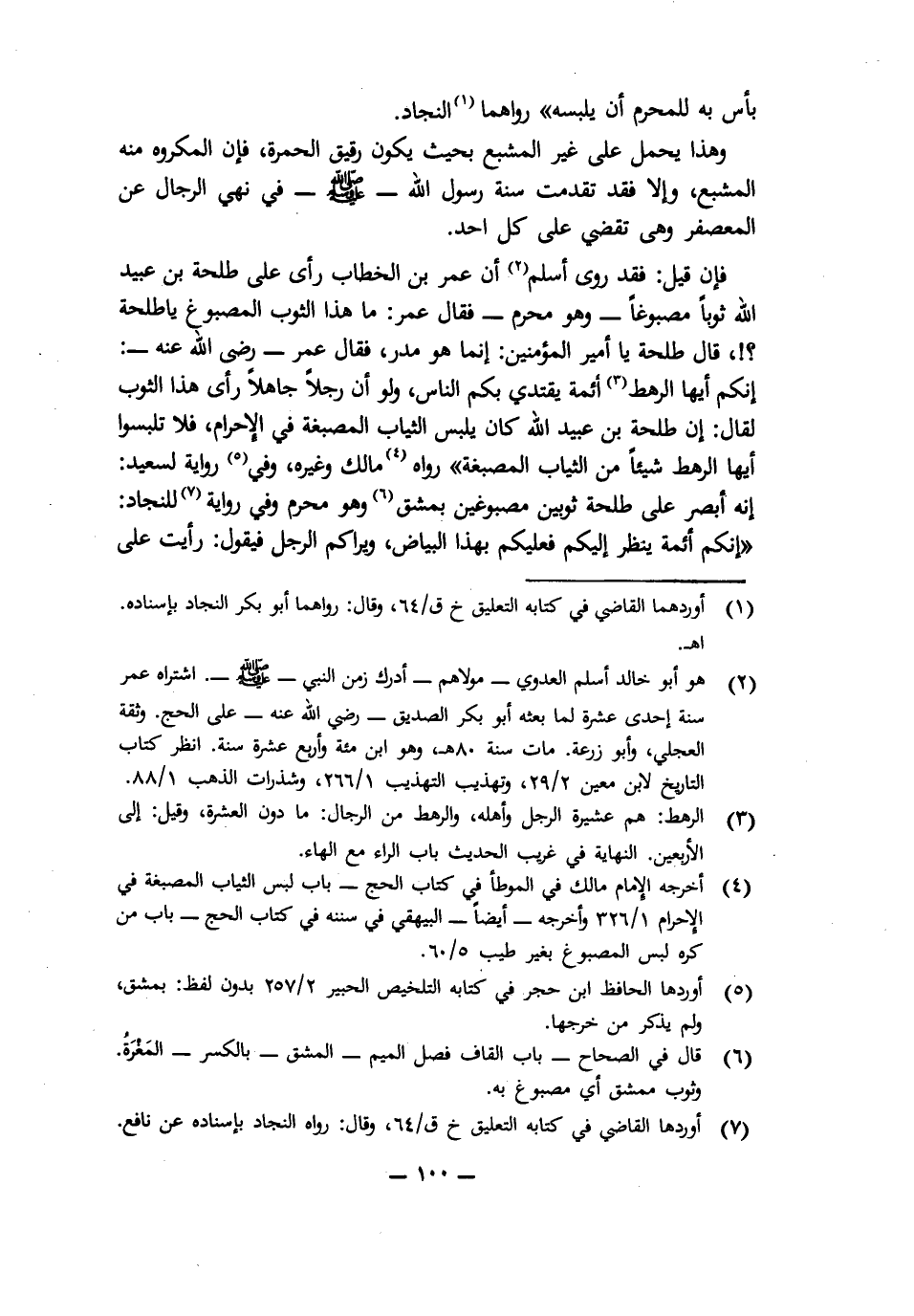 فَإِنْ قِيلَ: فَقَدْ رَوَى أَسْلَمُ أَنَّ عُمَرَ بْنَ الْخَطَّابِ رَأَى عَلَى طَلْحَةَ بْنِ عُبَيْدِ اللَّهِ ثَوْبًا مَصْبُوغًا وَهُوَ مُحْرِمٌ، فَقَالَ عُمَرُ: مَا هَذَا الثَّوْبُ الْمَصْبُوغُ يَا طَلْحَةُ؟ قَالَ طَلْحَةُ: يَا أَمِيرَ الْمُؤْمِنِينَ، إِنَّمَا هُوَ مَدَرٌ، فَقَالَ عُمَرُ - رَضِيَ اللَّهُ عَنْهُ -: إِنَّكُمْ أَيُّهَا الرَّهْطُ أَئِمَّةٌ يَقْتَدِي بِكُمُ النَّاسُ وَلَوْ أَنَّ رَجُلًا جَاهِلًا رَأَى هَذَا الثَّوْبَ لَقَالَ: إِنَّ طَلْحَةَ بْنَ عُبَيْدِ اللَّهِ كَانَ يَلْبَسُ الثِّيَابَ الْمُصْبَغَةَ فِي الْإِحْرَامِ، فَلَا تَلْبَسُوا أَيُّهَا الرَّهْطُ شَيْئًا مِنَ الثِّيَابِ الْمُصْبَغَةِ " رَوَاهُ مَالِكٌ وَغَيْرُهُ، وَفِي رِوَايَةٍ لِسَعِيدٍ: إِنَّهُ أَبْصَرَ عَلَى طَلْحَةَ ثَوْبَيْنِ مَصْبُوغَيْنِ بِمِشْقٍ وَهُوَ مُحْرِمٌ، وَفِي رِوَايَةٍ لِلنَّجَّادِ " إِنَّكُمْ أَئِمَّةٌ يُنْظَرُ إِلَيْكُمْ فَعَلَيْكُمْ بِهَذَا الْبَيَاضِ، وَيَرَاكُمُ الرَّجُلُ فَيَقُولُ رَأَيْتُ عَلَى