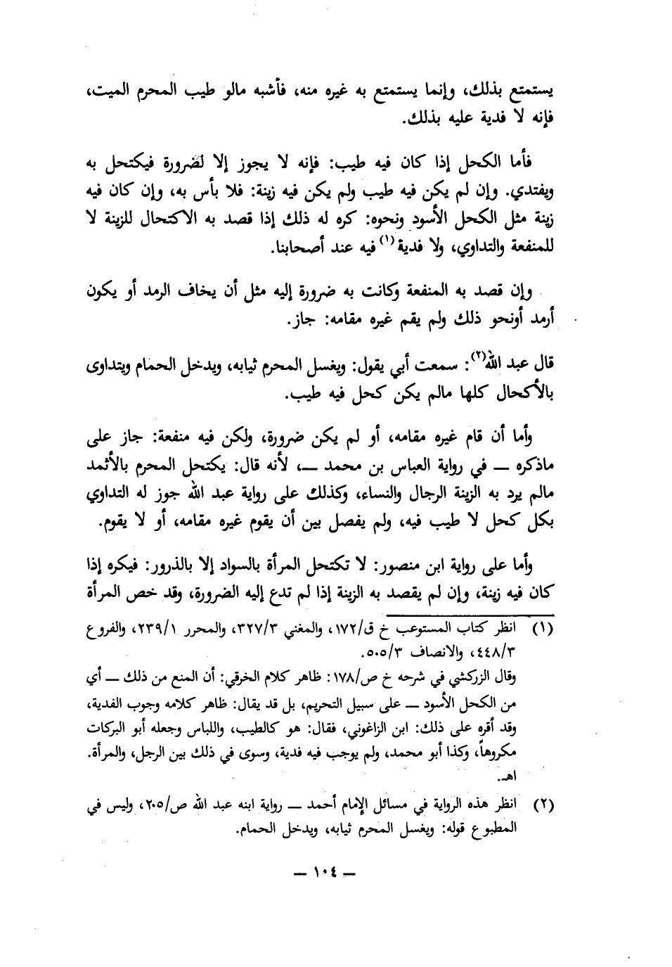 قَالَ عَبْدُ اللَّهِ: سَمِعْتُ أَبِي يَقُولُ: وَيَغْسِلُ الْمُحْرِمُ ثِيَابَهُ، وَيَدْخُلُ الْحَمَّامَ وَيَتَدَاوَى بِالْأَكْحَالِ كُلِّهَا مَا لَمْ يَكُنْ كُحْلٌ فِيهِ طِيبٌ.