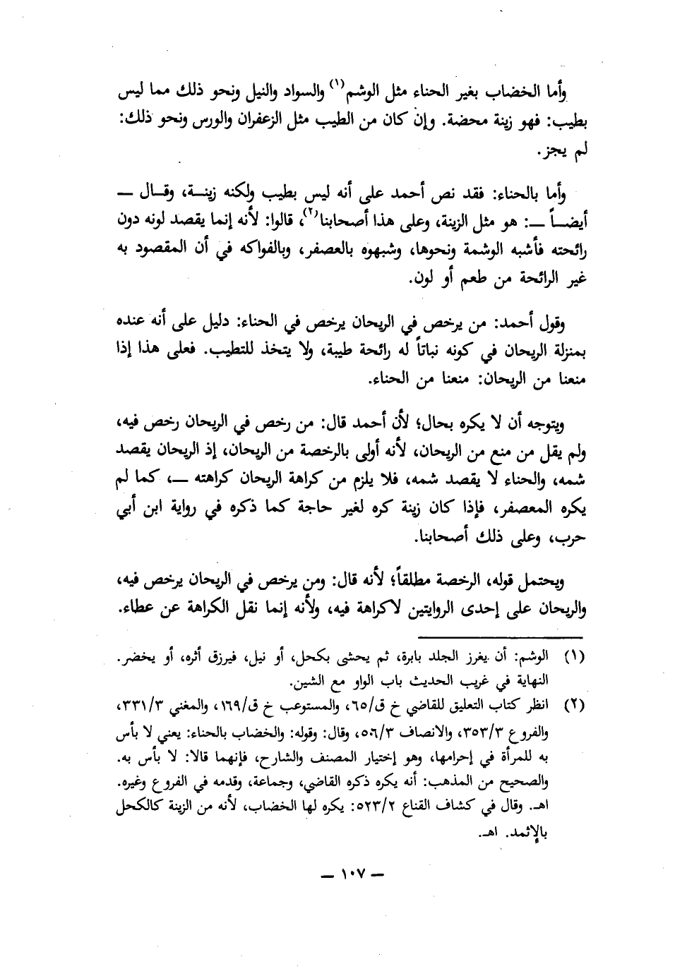 وَيَتَوَجَّهُ أَنْ لَا يُكْرَهَ بِحَالٍ ; لِأَنَّ أَحْمَدَ قَالَ: " مَنْ رَخَّصَ فِي الرَّيْحَانِ رَخَّصَ فِيهِ " وَلَمْ يَقُلْ: مَنْ مَنَعَ مِنَ الرَّيْحَانِ ; لِأَنَّهُ أَوْلَى بِالرُّخْصَةِ مِنَ الرَّيْحَانِ إِذِ الرَّيْحَانُ يُقْصَدُ شَمُّهُ، وَالْحِنَّاءُ لَا يُقْصَدُ شَمُّهُ فَلَا يَلْزَمُ مِنْ كَرَاهَةِ الرَّيْحَانِ كَرَاهَتُهُ كَمَا لَمْ يُكْرَهِ الْمُعَصْفَرُ، فَإِذَا كَانَ زِينَةً كُرِهَ لِغَيْرِ حَاجَةٍ كَمَا ذَكَرَهُ فِي رِوَايَةِ ابْنِ أَبِي حَرْبٍ وَعَلَى ذَلِكَ أَصْحَابُنَا.