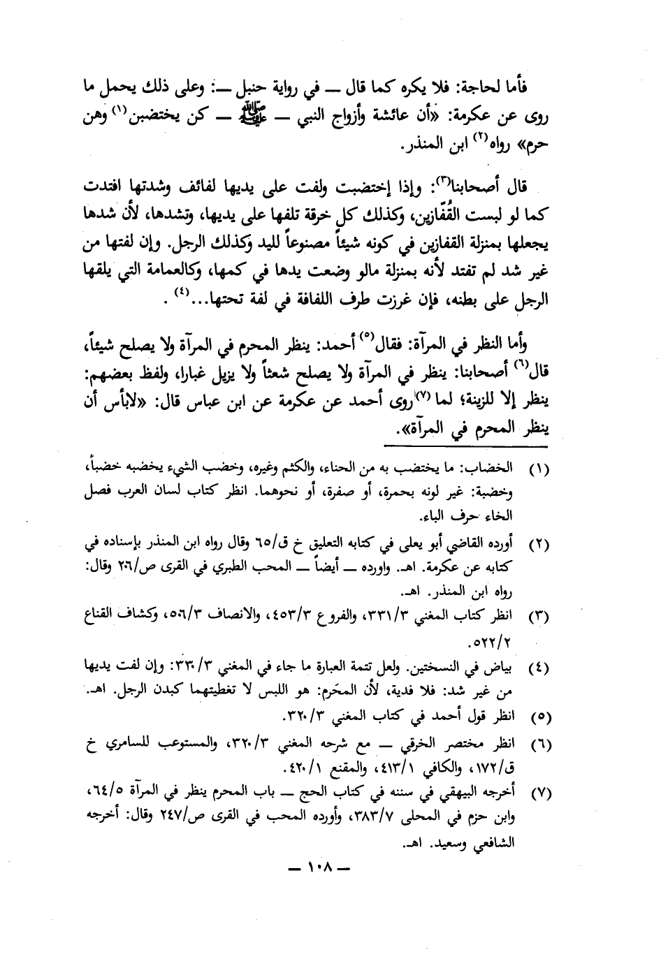 قَالَ أَصْحَابُنَا: " وَإِذَا اخْتَضَبَتْ وَلَفَّتْ عَلَى يَدَيْهَا لَفَائِفَ وَشَدَّتْهَا افْتَدَتْ كَمَا لَوْ لَبِسَتِ الْقُفَّازَيْنِ، وَكَذَلِكَ كُلُّ خِرْقَةٍ تَلُفُّهَا عَلَى يَدَيْهَا وَتَشُدُّهَا ; لِأَنَّ شَدَّهَا يَجْعَلُهَا بِمَنْزِلَةِ الْقُفَّازَيْنِ فِي كَوْنِهِ شَيْئًا مَصْنُوعًا لِلْيَدِ وَكَذَلِكَ الرِّجْلُ. وَإِنْ لَفَّتْهَا مِنْ غَيْرِ شَدٍّ لَمْ تَفْتَدِ ; لِأَنَّهُ بِمَنْزِلَةِ مَا لَوْ وَضَعَتْ يَدَهَا فِي كُمِّهَا، وَكَالْعِمَامَةِ الَّتِي يُلْقِهَا الرَّجُلُ عَلَى بَطْنِهِ، فَإِنْ غَرَزَتْ طَرَفَ اللِّفَافَةِ فِي لَفَّةٍ تَحْتَهَا