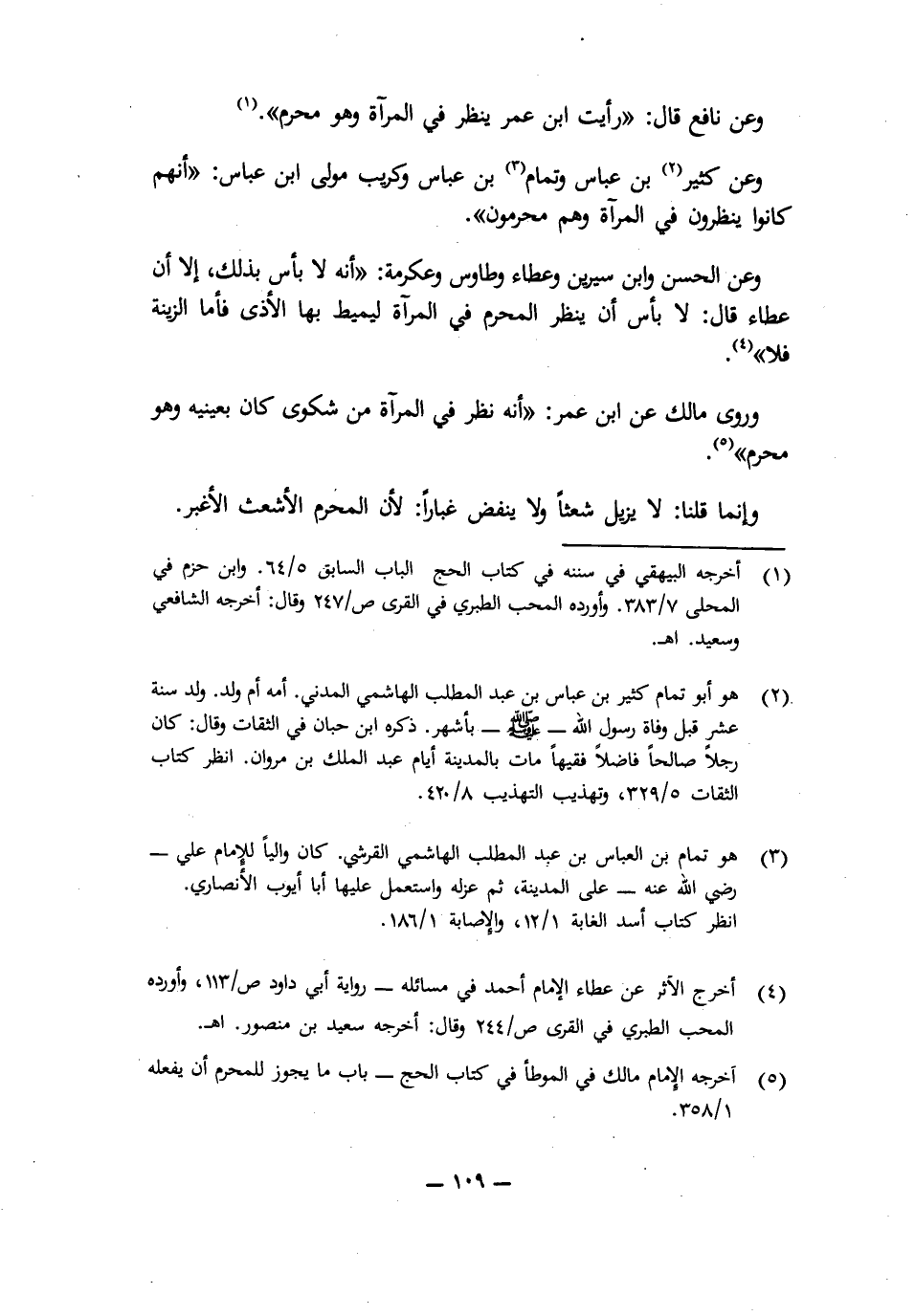 وَعَنْ كَثِيرِ بْنِ عَبَّاسٍ وَتَمَّامِ بْنِ عَبَّاسٍ وَكُرَيْبٍ مَوْلَى ابْنِ عَبَّاسٍ: " أَنَّهُمْ كَانُوا يَنْظُرُونَ فِي الْمِرْآةِ وَهُمْ مُحْرِمُونَ ".