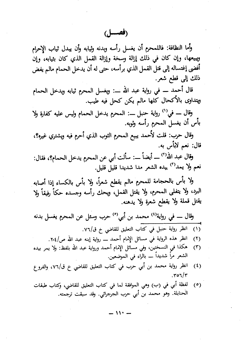وَقَالَ - فِي رِوَايَةِ حَنْبَلٍ -: " الْمُحْرِمُ يَدْخُلُ الْحَمَّامَ وَلَيْسَ عَلَيْهِ كَفَّارَةٌ وَلَا بَأْسَ أَنْ يَغْسِلَ الْمُحْرِمُ رَأْسَهُ وَثَوْبَهُ ".