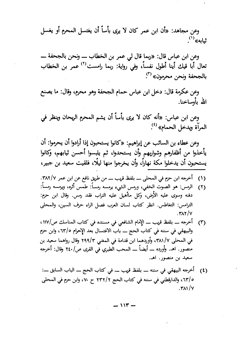 وَعَنْ عِكْرِمَةَ قَالَ: " دَخَلَ ابْنُ عَبَّاسٍ حَمَّامَ الْجُحْفَةِ وَهُوَ مُحْرِمٌ وَقَالَ: مَا يَصْنَعُ اللَّهُ بِأَوْسَاخِنَا ".