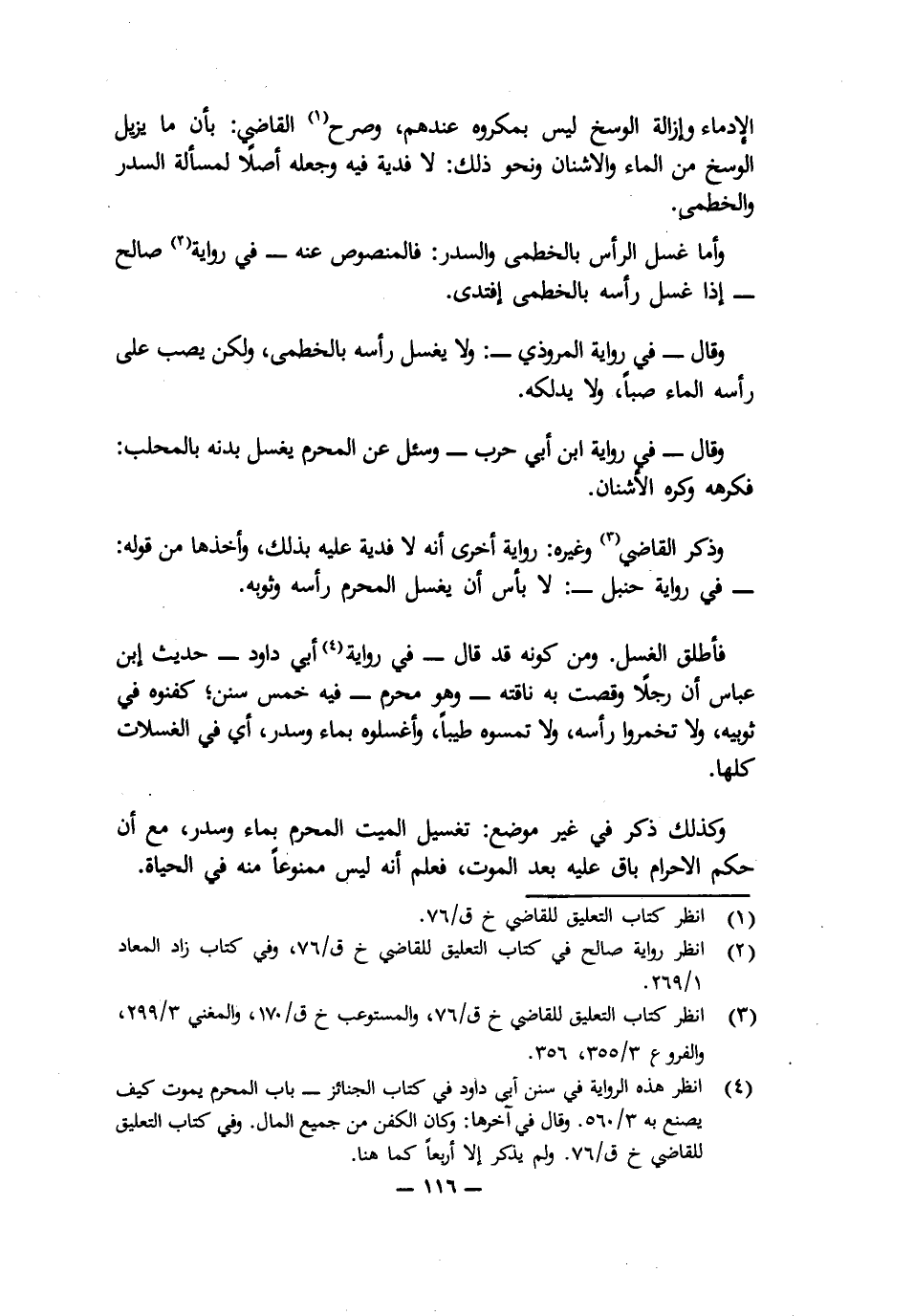 فَأَطْلَقَ الْغَسْلَ، وَمِنْ كَوْنِهِ قَدْ قَالَ - فِي رِوَايَةِ أَبِي دَاوُدَ - حَدِيثُ ابْنِ عَبَّاسٍ: " «أَنَّ رَجُلًا وَقَصَتْ بِهِ نَاقَتُهُ - وَهُوَ مُحْرِمٌ - فِيهِ خَمْسُ سُنَنٍ، كَفِّنُوهُ فِي ثَوْبَيْهِ، وَلَا تُخَمِّرُوا رَأْسَهُ، وَلَا تَمَسُّوهُ طِيبًا، وَاغْسِلُوهُ بِمَاءٍ وَسِدْرٍ، أَيْ فِي الْغَسْلَاتِ كُلِّهَا» ".