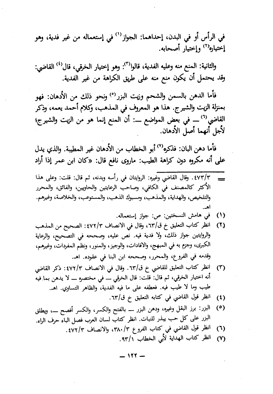فَأَمَّا الدُّهْنُ بِالسَّمْنِ وَالشَّحْمِ وَزَيْتِ الْبِزْرِ وَنَحْوِ ذَلِكَ مِنَ الْأَدْهَانِ فَهُوَ بِمَنْزِلَةِ الزَّيْتِ وَالشَّيْرَجِ، هَذَا هُوَ الْمَعْرُوفُ فِي الْمَذْهَبِ، وَكَلَامُ أَحْمَدَ يَعُمُّهُ، وَذَكَرَ الْقَاضِي فِي بَعْضِ الْمَوَاضِعِ أَنَّ الْمَنْعَ إِنَّمَا هُوَ مِنَ الزَّيْتِ وَالشَّيْرَجِ لِأَجْلِ أَنَّهُمَا أَصْلُ الْأَدْهَانِ.