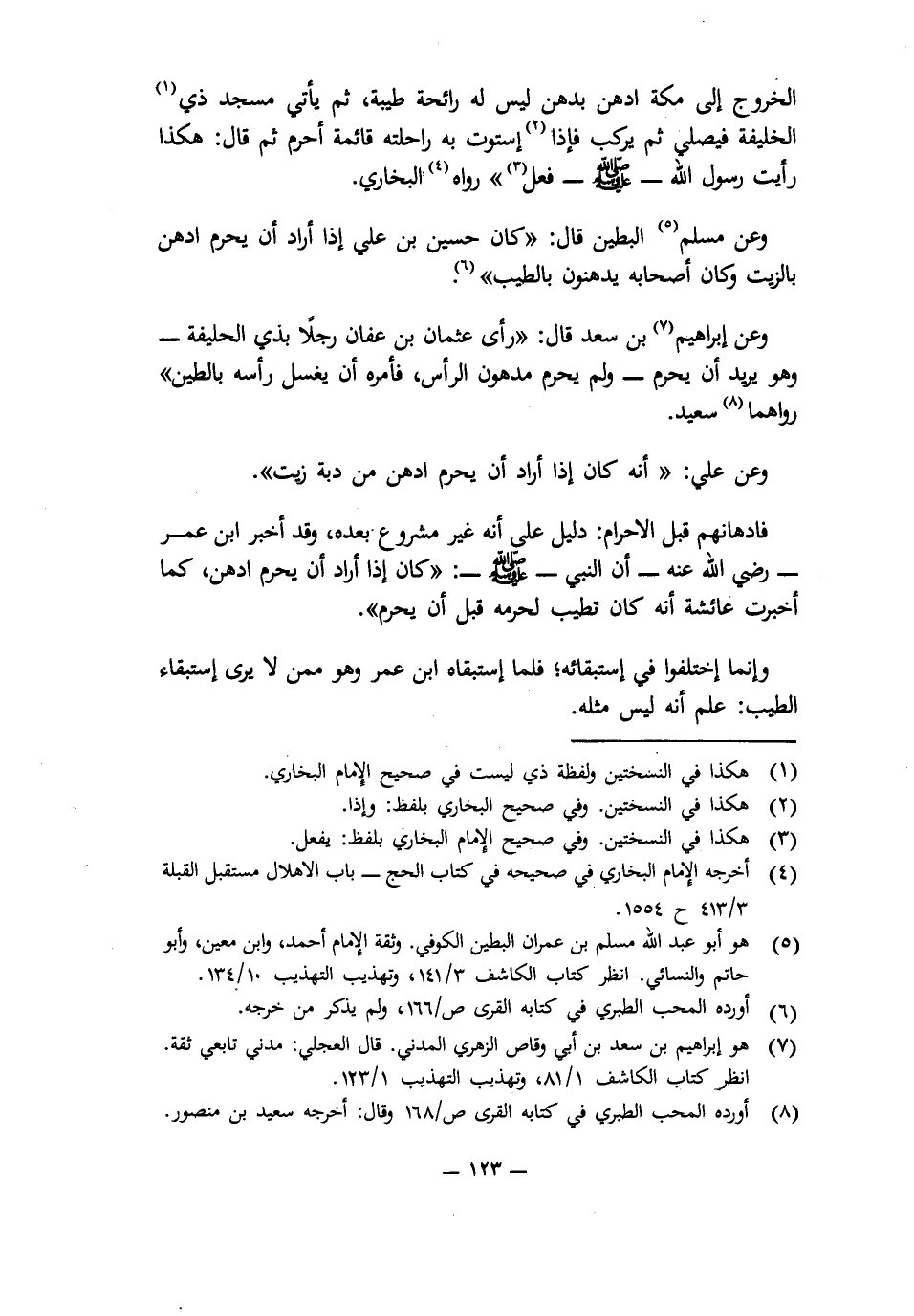 فَادِّهَانُهُمْ قَبْلَ الْإِحْرَامِ: دَلِيلٌ عَلَى أَنَّهُ غَيْرُ مَشْرُوعٍ بَعْدَهُ، وَقَدْ أَخْبَرَ ابْنُ عُمَرَ - رَضِيَ اللَّهُ عَنْهُ - «أَنَّ النَّبِيَّ - صَلَّى اللَّهُ عَلَيْهِ وَسَلَّمَ -: " كَانَ إِذَا أَرَادَ أَنْ يُحْرِمَ ادَّهَنَ كَمَا أَخْبَرَتْ عَائِشَةُ أَنَّهُ كَانَ تَطَيَّبَ لِحُرْمِهِ قَبْلَ أَنْ يُحْرِمَ».